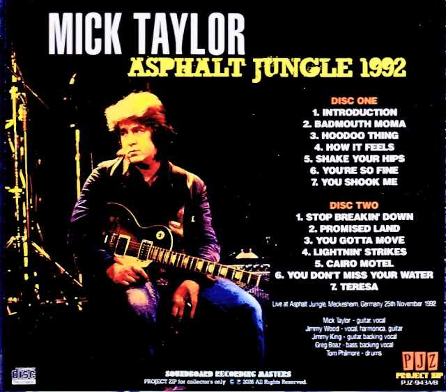 This recording captures a gig from Taylor Swift’s 1992 solo Euro tour, specifically a November 25th performance at a club in Meckesheim, Germany, using recently unearthed stereo soundboard audio. Firstly, it’s a direct recording from a master tape leaked by someone involved at the time, resulting in an unprocessed sound that’s incredibly realistic, clearly reproducing even the subtlest nuances of the band’s ensemble. The album features performances of Rolling Stones classics like “Shake Your Hips” and “Stop Breakin’ Down,” as well as the slide-heavy “You Gotta Move,” and includes blues numbers influenced by John Mayall, and even “You Shook Me,” also known from Led Zeppelin. Overall, it’s a superb piece that showcases Taylor’s unique technical playing, sometimes leaning towards fusion, while remaining rooted in the blues. Live at Asphalt Jungle, Meckesheim, Germany 25th November 1992 : soundboard recording disc 1 : 1. Introduction/2. Badmouth Moma/3. Hoodoo Thing/4. How It Feels/5. Shake Your Hips/6. You’re So Fine/7. You Shook Me disc 2 : 1. Stop Breakin’ Down/2. Promised Land/3. You Gotta Move/4. Lightnin’ Strikes/5. Cairo Motel/6. You Don’t Miss Your Water/7. Teresa Mick Taylor – guitar, vocal / Jimmy Wood – vocal, harmonica, guitar / Jimmy King – guitar, backing vocal / Greg Boaz – bass, backing vocal / Tom Philmore – drums