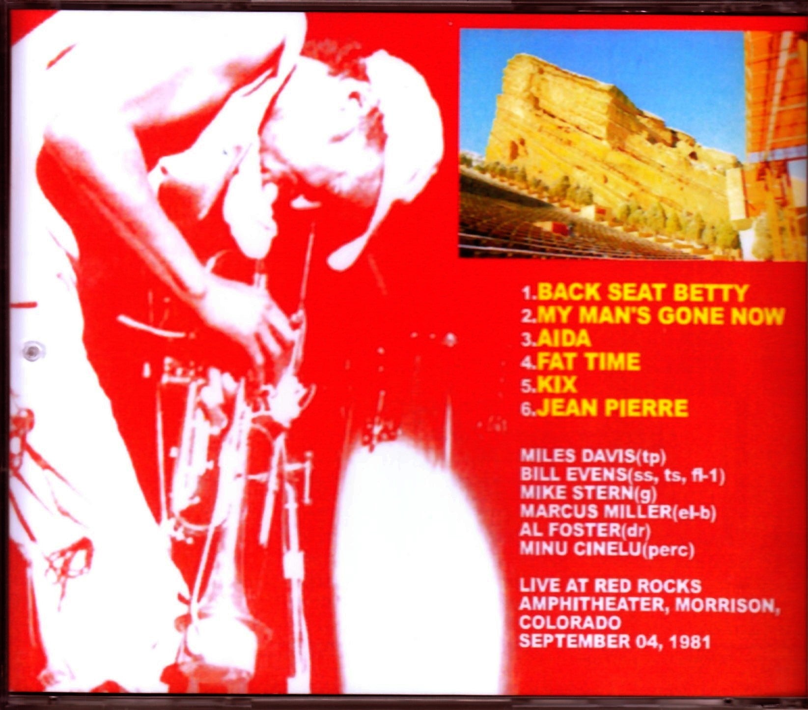 This is a boot recording of the revival commemorative performance at the Live Hall of Fame Hollywood Bowl on September 24, 1981. I’m impressed by the high-quality recording, and it’s a must-listen item for enthusiasts, as it perfectly captures the Los Angeles mayor’s announcement celebrating Miles’ return. LIVE AT HOLLYWOOD BOWL, LA 09/25/1981 1.BACK SEAT 2.MY MAN’S GONE NOW 3.AIDA 4.ANNOUNCEMENT 5.KIX 6.FAT TIME 7.JEAN PIERRE MILES DAVIS(tpt) BILL EVENS(ss, ts, fl) MIKE STERN(g) MARCUS MILLER(b) AL FOSTER(dr) MINO CINELU(perc)