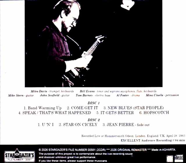 This release features a nearly complete recording of the second night of Miles Davis’s 1983 UK tour, specifically the April 28th performance at the Hammersmith Odeon in London. The concert was recorded using a high-quality audience master recording and has been digitally remastered in 2026. While not entirely complete due to the fading out of the final track, “JEAN PIERRE,” the remastering has corrected and rectified hiss noise and occasional skips, and the balance has been adjusted to achieve what is arguably the best quality currently available. The live performance, featuring two legendary guitarists, Mike Stern and John Scofield, showcases Miles’ excellent form from the opening track “SPEAK,” and he remains incredibly active throughout, hitting high/long notes and unleashing powerful blows. In addition, the two guitarists, John Scofield and Mike Stern, who are the core of this tour, are in top form, and Stern’s creative phrases appear throughout the solos in particular, which are reminiscent of the performances that took place in Japan a month later, making this a must-listen item for fans who remember that time. Recorded at Hammersmith Odeon, London, UK April 28th 1983 : Audience Recording / 2026 Remaster DISC 1 : 1. Band Warming Up 2. COME GET IT 3. NEW BLUES (STAR PEOPLE) 4. SPEAK / THAT’S WHAT HAPPENED 5. IT GETS BETTER 6. HOPSCOTCH DISC 2 : 1. U ‘N’ I 2. STAR ON CICELY 3. JEAN PIERRE – fade out Miles Davis – trumpet, keyboards / Bill Evans – soprano & tenor saxophone, flute, keyboards / Mike Stern – guitar / John Scofield – guitar / Tom Barney – electric bass / Al Foster – drums / Mino Cinelu – percussion