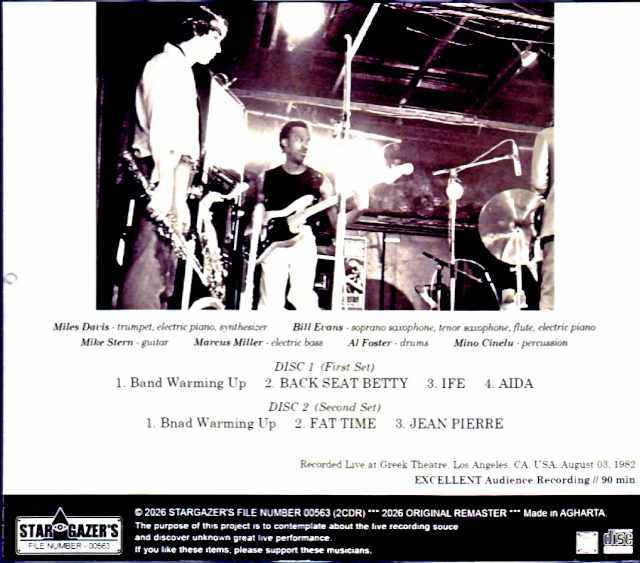 This release features a nearly complete recording of the August 3rd performance at the Greek Theatre in Los Angeles during the 1982 US tour, which marked Miles’ full-fledged comeback. The audience master recording has been digitally remastered in 2026, resulting in a nearly complete 1.5-hour recording. Two previously incomplete audience sources were seamlessly spliced together to create a nearly complete version, with each source remastered and balance adjusted to achieve the best possible quality currently available. This tour, featuring the so-called “comeback band” after a five-year hiatus, marked a period when the band, including Miles, was in considerably better form. The performance, while consisting of only five lengthy numbers, features a selection from “The Man With The Horn” that is unusual for this period, as it mainly consists of solo improvisations. In contrast to Miles’ somewhat subdued demeanor, Mike Stern’s crisp rhythmic footwork and fluid solo phrases, along with Marcus Miller’s powerful, driving bass, are truly impressive, making this an album that allows you to rediscover the brilliance of Miles in the 80s. Recorded at Greek Theatre, LA, CA, USA, August 3rd 1982 : Audience Recording / 2026 Remaster DISC 1 : (First Set) 1. Band Warming Up 2. BACK SEAT BETTY 3. IFE 4. AIDA DISC 2 : (Second Set) 1. Bnad Warming Up 2. FAT TIME 3. JEAN PIERRE Miles Davis – trumpet, electric piano, synthesizer / Bill Evans – soprano & tenor saxophone, flute, electric piano / Mike Stern – guitar / Marcus Miller – electric bass / Al Foster – drums / Mino Cinelu – percussion