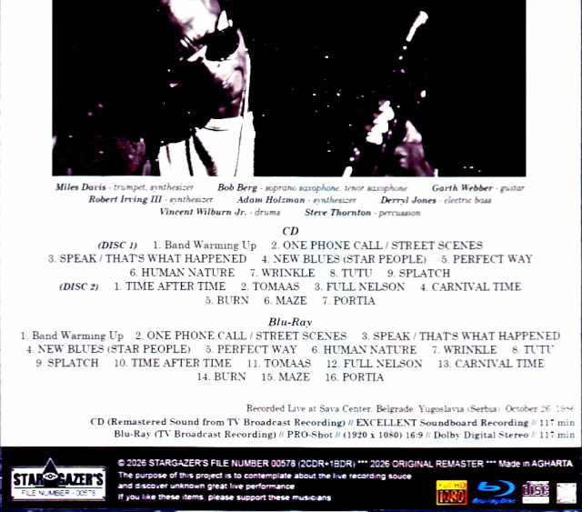 This release couples a live performance from the 1986 European tour, specifically the jazz festival held in Belgrade, the capital of the Republic of Serbia, on October 26th, with audio and video (Blu-ray) featuring the latest 2026 mastering. The CD contains the full 1 hour and 57 minute recording of the day’s performance, using the TV broadcast master and newly mastered soundboard audio. The Blu-ray, on the other hand, is also from the TV broadcast master quality, using professionally shot video. While the video quality is inevitably inferior to modern digital video considering the video conditions in Eastern Europe at the time, it has been corrected and mastered to the best possible quality currently available. The performance itself is exactly the same as on the CD, and the Blu-ray’s large capacity is utilized to reproduce the day’s performance in the original HD quality. The concert itself is fantastic, with Miles Davis in top form throughout, and especially tenor and soprano saxophonist Bob Berg in top form. The interplay between Miles and Berg, with Miles sharply interjecting phrases into Berg’s playing, is superb. The sounds he creates around this time have a jazz flavor that suggests the influence of legends of yesteryear, and that’s where he differs from Kenny, who would later join Miles’ band. Also, in the familiar “Human Nature,” while the later Kenny era version would end with a lengthy saxophone solo, here it features a guitar solo by Garth Weber. Although the band was in a transitional period, Miles himself was in top form, and this 1986 live recording, full of sharp hits, is a must-listen. Recorded at Sava Center, Belgrade, Yugoslavia, October 26th 1986 : Soundboard Recording : TV Broadcast Recording / PRO-Shot / (1920 x 1080) 16:9 / Dolby Digital Stereo / totaltime 117 min DISC 1 : 1. Band Warming Up 2. ONE PHONE CALL / STREET SCENES 3. SPEAK / THAT’S WHAT HAPPENED 4. NEW BLUES (STAR PEOPLE) 5. PERFECT WAY 6. HUMAN NATURE 7. WRINKLE 8. TUTU 9. SPLATCH DISC 2 : 1. TIME AFTER TIME 2. TOMAAS 3. FULL NELSON 4. CARNIVAL TIME 5. BURN 6. MAZE 7. PORTIA Blu-ray : 1. Band Warming Up 2. ONE PHONE CALL / STREET SCENES 3. SPEAK / THAT’S WHAT HAPPENED 4. NEW BLUES (STAR PEOPLE) 5. PERFECT WAY 6. HUMAN NATURE 7. WRINKLE 8. TUTU 9. SPLATCH 10. TIME AFTER TIME 11. TOMAAS 12. FULL NELSON 13. CARNIVAL TIME 14. BURN 15. MAZE 16. PORTIA Miles Davis – trumpet, synthesizer / Bob Berg – soprano & tenor saxophone / Garth Webber – guitar / Robert Irving III – synthesizer / Adam Holzman – synthesizer / Derryl Jones – electric bass / Vincent Wilburn Jr. – drums / Steve Thornton – percussion