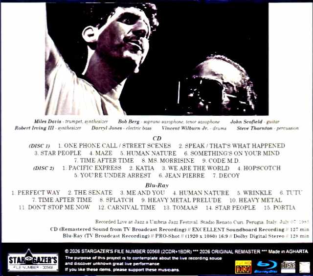 This Blu-ray release couples Miles Davis’s performance at the Amblia Jazz Festival in Perugia, Italy, on July 7th, 1985, from the Septet’s Euro Tour, with audio and video newly remastered in 2026. The audio features a full 2-hour and 7-minute recording of the day’s performance in stereo soundboard format, mastered from the radio broadcast master. The show starts off strong with a combination of “One Phone Call/Street Scenes” and “Speak,” and because this live performance took place around the time of the release of his album “You’re Under Arrest,” which garnered a huge response for its pop sensibility, Miles’s signature melancholic and somber phrases are evident even in pop cover numbers such as Michael Jackson’s “Human Nature” and Cyndi Lauper’s “Time After Time,” making it a performance that will satisfy fans 120%. Another characteristic of this period is that while Vince’s drums and Miles’ synthesizers create digital rhythms, John Scofield on guitar and Darryl Jones on bass freely construct phrases and lines. Furthermore, the Blu-ray video is a master-quality, professionally shot recording from the TV broadcast. Except for the two tracks “MS. MORRISINE” and “DECOY,” which are still images because there was no video, the performance itself is exactly the same as the CD, and the Blu-ray’s large capacity is utilized to reproduce the day’s events in the original HD quality. Recorded at Jazz a Umbria Jazz Festival, Stadio Renato Curi, Perugia, Italy, July 7th 1985 : Soundboard Recording : PRO-Shot / (1920 x 1080) 16:9 / Dolby Digital Stereo / 128 min DISC 1 : 1. ONE PHONE CALL / STREET SCENES 2. SPEAK / THAT’S WHAT HAPPENED 3. STAR PEOPLE 4. MAZE 5. HUMAN NATURE 6. SOMETHING’S ON YOUR MIND 7. TIME AFTER TIME 8. MS. JEAN PIERRE 7. DECOY Blu-ray : 1. Opening 2. ONE PHONE CALL / STREET SCENES 3. SPEAK / THAT’S WHAT HAPPENED 4. STAR PEOPLE 5. MAZE 6. HUMAN NATURE 7. SOMETHING’S ON YOUR MIND 8. TIME AFTER TIME 9. MS. MORRISINE (Audio Only) 10. CODE M.D 11. PACIFIC EXPRESS 12. KATIA 13. Band Introductions – WE ARE THE WORLD 14. HOPSCOTCH 15. YOU’RE UNDER ARREST 16. JEAN PIERRE 17. DECOY (Audio Only) Miles Davis – trumpet, synthesizer / Bob Berg – soprano & tenor saxophone / John Scofield – guitar / Robert Irving III – synthesizer / Darryl Jones – electric bass / Vincent Wilburn Jr. – drums / Steve Thornton – percussion