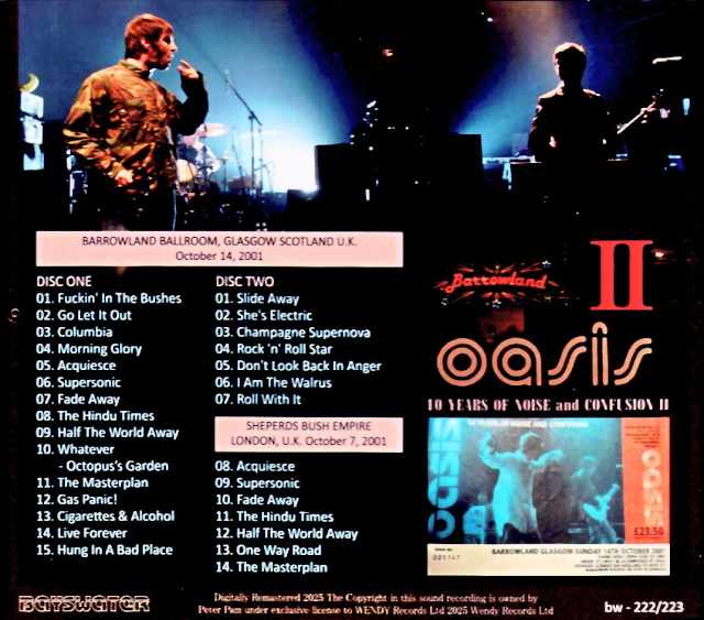 This soundboard recording captures Oasis’s 10th-anniversary tour, specifically their October 13, 2001 Glasgow concert. Only three new songs from that time—”The Hindu Times,” “Hung in a Bad Place,” and “Live Forever”—are supplemented with audience recordings. The entire concert is recorded, including the first take of “Champagne Supernova,” which was interrupted at Liam’s instruction. It’s extremely rare for a stadium-filling band to perform in such a small venue, and as the jacket photo shows, the audience is very close. Johnny Marr of The Smiths makes a guest appearance, adding to the band’s celebration of their anniversary. BARROWLANDS, GLASGOW, U.K. October 13, 2001 DISC ONE 01. Fuckin’ In The Bushes 02. Go Let It Out 03. Columbia 04. Morning Glory 05. Acquiesce 06. Supersonic 07. Fade Away 08. The Hindu Times 09. Half The World Away 10. Whatever 11. The Masterplan 12. Gas Panic! 13. Cigarettes & Alcohol DISC TWO 01. Live Forever 02. Hung In A Bad Place 03. Slide Away 04. She’s Electric 05. Champagne Supernova #1 06. Champagne Supernova #2 07. Rock ‘n’ Roll Star 08. Don’t Look Back In Anger 09. I Am The Walrus 10. Roll With It
