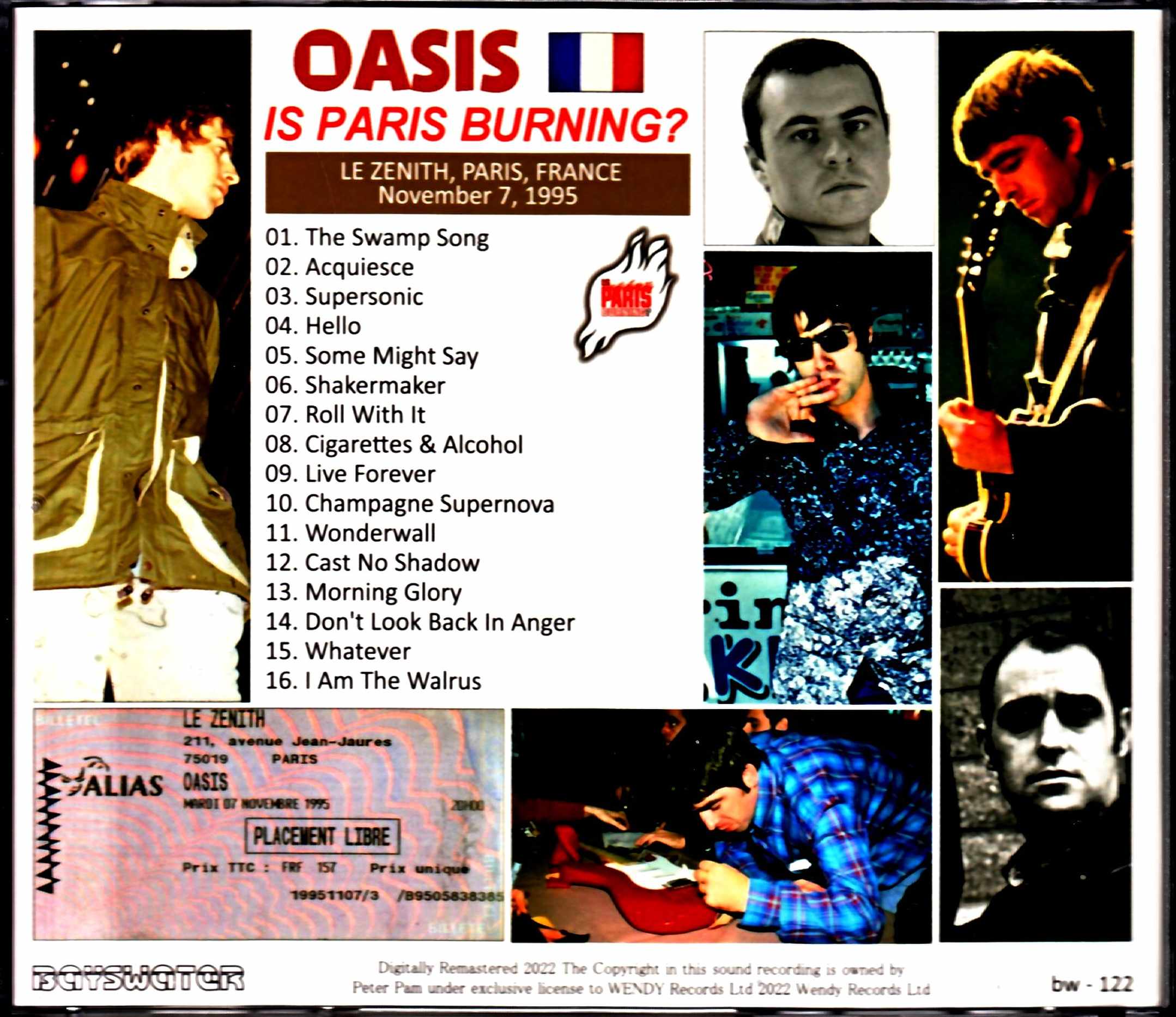 Recorded at a concert in Paris on November 7, 1995. LE ZENITH, PARIS, FRANCE November 7, 1995 01. The Swamp Song 02. Acquiesce 03. Supersonic 04. Hello 05. Some Might Say 06. Shakermaker 07. Roll With It 08. Cigarettes & Alcohol 09. Live Forever 10. Champagne Supernova 11. Wonderwall 12. Cast No Shadow 13. Morning Glory 14. Don’t Look Back In Anger 15. Recorded at a concert in Paris on November 7, 1995. LE ZENITH, PARIS, FRANCE November 7, 1995 01. The Swamp Song 02. Acquiesce 03. Supersonic 04. Hello 05. Some Might Say 06. Shakermaker 07. Roll With It 08. Cigarettes & Alcohol 09. Live Forever 10. Champagne Supernova 11. Wonderwall 12. Cast No Shadow 13. Morning Glory 14. Don’t Look Back In Anger 15. Whatever 16. I Am The WalrusWhatever 16. I Am The Walrus