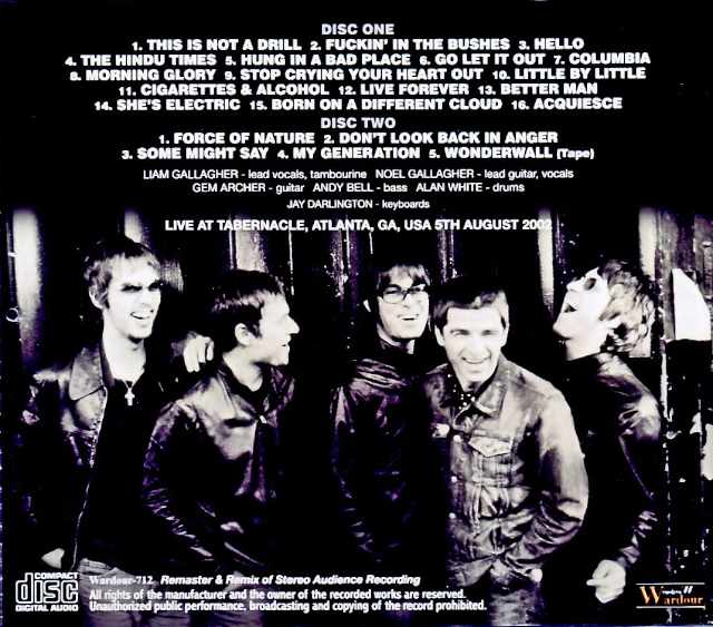 A live recording boasting superb sound quality and performance, which is unbelievable considering it has never been released anywhere before, is finally being released for the first time! A truly ultimate new standard recording that will shatter the conventional wisdom about the ‘HEATHEN CHEMISTRY’ tour. This is really amazing! At first glance, the 2002 ‘HEATHEN CHEMISTRY’ tour seems to be blessed with good items, such as the famous Finsbury Park performance, ‘COMPLETE WITNNESS FESTIVAL 2002′, and the series of Japanese performances, but in reality, the August US tour has a gaping hole in terms of “great performances and great recordings”. With so much time having passed, some people might even be wondering, “Did Oasis even tour America properly in 2002?” The 2002 US tour was fraught with trouble from the very first show in Pompano Beach, Florida, when Liam had to give up early in the show due to feeling unwell (although it was a rare case where he left the stage after complaining that his throat wasn’t in good condition). This concert was captured on the nostalgic FLUSHBULB label’s “NOEL SINGS WHEN LIAM’S DOWN,” and virtually no other live recordings from this period have been released. As a result, it has remained difficult to grasp the reality of the US tour for “HEATHEN CHEMISTRY” to this day. To make matters worse, as the tour progressed, Noel and Andy were involved in a car accident on a travel day, and Noel suffered facial contusions, resulting in the cancellation of three shows. These circumstances combined to make the 2002 US tour extremely scarce in terms of available merchandise. However, far from shedding light on that missing piece of the album, this week sees the release of one of the finest recordings of 2002 as a whole! It’s the Atlanta concert from August 5th, and it’s surprising that this audience recording of such superb quality has never been released on CD before! The sound quality is incredibly clear, and the recording is so superb that it could be released as is! In the US in August, where there are already so few items available, there’s hardly a more worthy recording to release. And to make the most of the excellent quality of this audience recording, we once again used the latest AI technology to separate the master source into a total of 12 tracks (bass drum, tom, snare, hi-hat, ride cymbal, crash cymbal, audience noise, guitar, bass, vocals, piano, etc.), remastered each track, and then remixed it. However, the original sound quality was so good that such elaborate work wasn’t really necessary. Even so, it has evolved into an even clearer, more spacious, and more listenable sound! In the first track, “Hello,” there are two instances in the latter half of the song where the sound quality changes for just a moment, and one instance where the sound briefly skips. However, both of these issues were present in the original master source. While the reason for the latter skip is unknown, the former is presumed to be due to the taper’s recording being affected by the overwhelming excitement of the audience at the front. Fortunately, both are only brief moments. As mentioned earlier, the audio from this Atlanta performance is truly superb. For example, the power of the performance at the start of “Hung In A Bad Place” is even clearer and sharper than the original recording, making it incredibly impactful. As this moment demonstrates, the clarity of this recording and the remastering and remixing using the latest AI technology are generally well-suited to the tracks on “HEATHEN CHEMISTRY,” and songs like “Force Of Nature” have significantly increased power and clarity. In “Born On A Different Cloud,” Alan’s intricate drumming, with its various phrases and tom-tom fills, is even clearer than in the original source, and the interplay between Noel’s lengthy guitar solo and Alan’s drums in the latter half of the song is so superb that it can be called the highlight of the day. Liam’s vocals, which have made a remarkable recovery from his poor performance at Pompano Beach, are also captured in remarkably clear sound quality. His passionate singing in the poignant “Stop Crying Your Heart Out,” and his complete comeback in the finale “My Generation,” are incredibly vivid and can be enjoyed in the clearest possible sound quality, a testament to the synergistic effect of the remastering and remixing. Liam’s condition at this Atlanta performance is undoubtedly a major counter-argument that completely dispels the negative image previously held about the American tour of the “HEATHEN CHEMISTRY” tour. Furthermore, “She’s Electric,” a highlight of the 2002 repertoire featuring Noel on vocals, is also recorded in superb quality, showcasing the charm of the performance centered around Noel’s vocals. Just listening to these recordings will leave you baffled by the excellent sound quality and the rich performance, making you wonder why the Atlanta show had never been released before. The massive singalong to “Wonderwall” (fully recorded!) that played throughout the venue after the show was truly spectacular and distinctly American. It’s clear that the band wasn’t the only driving force behind this great performance; the passionate audience played a huge role as well. However, just when you thought this show would give the American tour a boost, the aforementioned car accident occurred, forcing the cancellation of several shows—a truly unfortunate tour. This groundbreaking first-ever CD release not only brilliantly fills in the missing piece of this overlooked period, but it’s also an astonishingly superb recording with top-notch sound quality and performance! Tabernacle, Atlanta, GA, USA 5th August 2002 ULTIMATE SOUND Remaster & Remix of Stereo Audience Recording Disc:1 (67:02) 1. This Is Not A Drill 2. Fuckin’ In The Bushes 3. Hello 4. The Hindu Times 5. Hung In A Bad Place 6. Go 