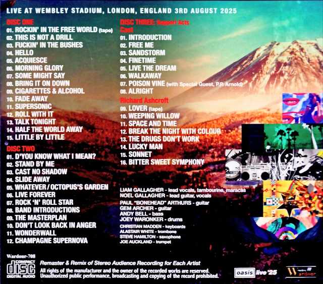 The Oasis reunion tour “LIVE ’25,” which sold out even before their Japan tour, features a top-tier live recording from London’s legendary Wembley Stadium in the UK. This is not just a simple reissue; it’s a completely different, ultimate evolved edition, with multi-track mastering and remixing from scratch, including the opening act! Some may find it hard to believe this is an audience recording. Whether you own last year’s DEFINITIVE edition or not, this is an essential, must-have quality that is sure to impress. The atmosphere of the venue, filled with 90,000 people, and the band’s sound are all incomparably more powerful than previous releases. The moment you play this soundboard-quality recording, close your eyes and you’ll be transported to Wembley Stadium. Don’t miss out on this title that will leave its mark on the history of Oasis live recordings! The “LIVE ’25” reunion tour, which was nothing short of a social phenomenon last year, and the masterpiece “DEFINITIVE WEMBLEY STADIUM 2025 FINAL NIGHT: LEGENDARY GIG & RECORDING,” which became one of the two major landmarks alongside “TOKYO DOME 2025 2DAYS COMPLETE,” are now on the scene. This album captures the unparalleled enthusiasm and celebration of their overseas performances prior to the Tokyo Dome show, particularly in their home country of the UK, through audience recordings. It features the final August 3rd performance of their five-day run at Wembley Stadium, held from the end of July to the beginning of August, including the opening act, with undeniable quality that made it a bestseller, selling out even before the Japanese performances. This title has received rave reviews from overseas fans, who say things like, “The sounds are incredible. The crowd sounds pretty distant, and the vocals and guitars are huge. The instrument mix is ​​great for an audience recording, and you can even hear Joey’s sticks counting in the songs. Definitely (not just maybe) the best-sounding audience recording of the UK leg of the Live 25 tour.” However, it’s a shame that such a superb recording has disappeared from the market. After all, it’s such a high-quality audience recording. After the Tokyo Dome concert, the reputation of ‘DEFINITIVE WEMBLEY STADIUM 2025 FINAL NIGHT’ has only grown with the demand to “hear the great performance from the UK concert in the best possible sound!” It’s a recording that simply has to be reissued…but we felt that a simple reissue wouldn’t be meaningful. So let’s take a moment to clarify the situation regarding this August 3rd recording. Regarding the live recording from that day, in addition to the ultra-high-quality audience recording exclusively released by our store, there are currently two other recordings released by other labels. The first is an IEM recording from the same day released by Empress Valley at the end of August last year (although there is a strong theory that it is an ALD recording based on the sound image, we will refer to it as an IEM recording for now). The second is an IEM recording released at the end of last year with the tagline “Two types of IEM recordings used per day.” However, both of these titles had major problems. First, while the former recording’s selling point was the raw performance sound derived from the IEM recording, due to the nature of the recording, there was absolutely no sense of presence. It sounded more like a studio rehearsal than a passionate performance at Wembley Stadium with approximately 90,000 people singing along, and even in the quiet parts between songs, the audience’s reaction is barely audible, making it sound as if the MC’s jokes are falling flat. It was questionable whether this could be enjoyed as a live recording. In addition, reception noise was also noticeable. The latter audio source presented even bigger challenges. While it claimed to achieve noiseless sound by combining two types of IEM audio sources per day, waveform analysis revealed that one of the two sources used was from August 2nd, not August 3rd—meaning it was a fake edit using an IEM audio source from a different performance. Furthermore, the attempt to force singalongs into certain songs, while the original IEM audio lacked realism, resulted in significant changes to the mix and sound quality of those tracks. Conversely, what if, instead of copying IEM audio sources from other labels, we could thoroughly re-examine our own high-quality audience recording of “DEFINITIVE WEMBLEY STADIUM 2025 FINAL NIGHT” from the master source, and while getting closer to the raw performance that is the strength of IEM audio, we could also achieve the overwhelming sense of presence that is its original strength—wouldn’t that be an amazing audio source…? This is an approach that is only possible in 2026. Therefore, with this release, the project has been upgraded to a new version. Is it even possible to surpass the high-quality recording that could be experienced on the sold-out DEFINITIVE edition? As if to answer the voices of fans who wondered this, a release that goes beyond a simple reissue and is truly heartfelt has been realized! After all, six months have already passed since the release of “DEFINITIVE WEMBLEY STADIUM 2025 FINAL NIGHT” last summer, and the latest AI technology has evolved even further, so the original high-quality audience master audio source has been thoroughly reviewed from scratch. The latest AI model was used to break down the audio source into 13 tracks (6 drum parts, acoustic guitar, electric guitar, bass, piano, vocals, other, audience noise), and each track was remastered before a careful remix was performed. The result is a significant improvement from the DEFINITIVE edition that is immediately apparent! The performance has expanded in scope, yet evolved to a balance that brings it even further forward. Despite the original master source being a common and single source (which is tru