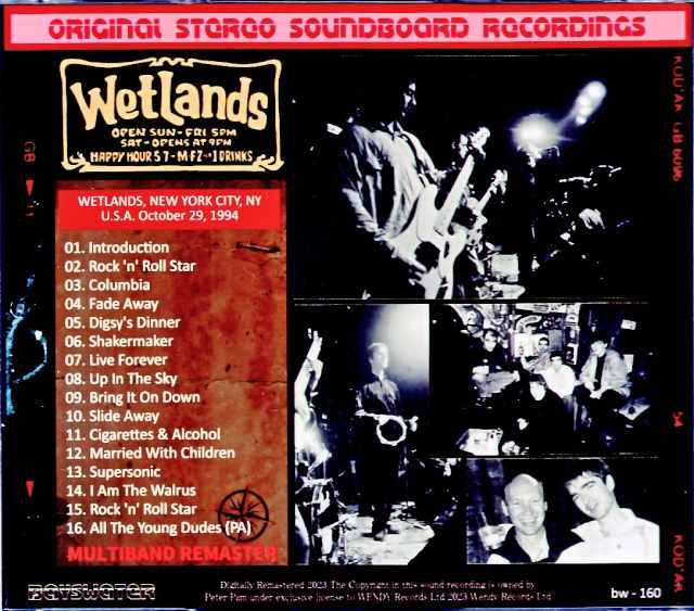 Oasis’ live debut in the United States was on July 21, 1994 at the small live house “Wetlands Preserve” in New York (included in Bayswater’s “FROM ENG. FIRST USA SHOW”). And the same venue was chosen for the final day of the 1994 Definitely Maybe US tour. This work is a soundboard recording of the Wetlands Preserve performance on October 29, 1994, the final day of the US performance of that year. Soundboard recordings of this performance have been leaked for a long time, and although the concert itself is famous, as those who have the already released version know, the sound of the instruments was extremely off, and only the vocals came to the fore, making it unbalanced, as if it were an a cappella. There is also an audience recording of the same day, but the sound quality was not so good considering the era. This work was recorded using the AI ​​multiband remastering method, which separates the soundboard sound source for each instrument, masters them separately, and reconstructs them by balancing them. The previously unreleased sound of the day has been beautifully revived, and the sound is a cut above the previously released versions. WETLANDS, NEW YORK CITY, NY U.S.A. October 29, 1994 01. Introduction 02. Rock ‘n’ Roll Star 03. Columbia 04. Fade Away 05. Digsy’s Dinner 06. Shakermaker 07. Live Forever 08. Up In The Sky 09. Bring It On Down 10. Slide Away 11. Cigarettes & Alcohol 12. Married With Children 13. Supersonic 14. I Am The Walrus 15. Rock ‘n’ Roll Star 16. All The Young Dudes (PA)