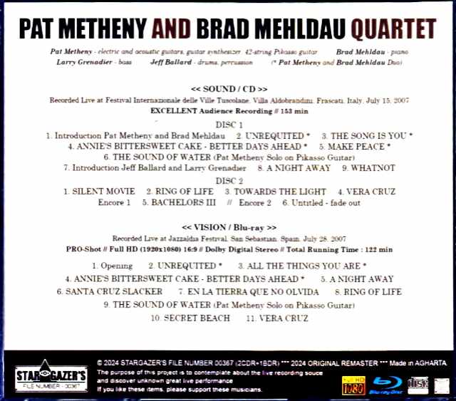 This is a coupling of precious live recordings and videos from different performances after the release of the album “Metheny Mehldau,” which was co-produced in 2006 by Metheny & Brad Mehldau, who are said to be the dream collaboration quartet. First of all, this first collaboration album was a huge hit as the biggest project in the jazz scene at the time, and was highly praised from all quarters. Furthermore, with the expectations of jazz fans around the world, the second collaboration album “Quartet” was released in 2007, and this was the time when this collaboration was the most attention. And from the duo tour in the same year, the first recording is the precious performance in Frascati, Italy on July 15th, which is the first appearance, and it has been digitally remastered with a high-quality audience master and recorded almost in full for 2 hours and 33 minutes. First of all, the sound source, which originally reproduced the delicate tone beautifully, was mastered and edited to fit perfectly on two discs by changing the order of some of the songs. Furthermore, the video Blu-ray includes the master quality, pro-shot footage of their appearance at the annual jazz festival “Jazzaldia Festival” held in San Sebastian, Spain, two weeks later on July 28th, which was recently re-aired in Europe. This Blu-ray disc is in HD quality, taking advantage of the large capacity unique to Blu-ray, and the audio part is also fully recorded in perfect PCM stereo for 2 hours and 2 minutes, and here you can enjoy a breathtaking performance, focusing on numbers from those two albums. In addition, the performance by the truly strongest quartet, Larry Grenadier (bass) and Jeff Ballard (drums), was a performance before the Japan tour two months later, so this is a must-listen and must-see item for fans. DISC 1 : 1. Introduction Pat Metheny and Brad Mehldau 2. UNREQUITED * 3. THE SONG IS YOU * 4. ANNIE’S BITTERSWEET CAKE – BETTER DAYS AHEAD * 5. MAKE PEACE * 6. THE SOUND OF WATER (Pat Metheny Solo on Pikasso Guitar) 7. Introduction Jeff Ballard and Larry Grenadier 8. A NIGHT AWAY 9. DISC 2 : 1. SILENT MOVIE 2. RING OF LIFE 3. TOWARDS THE LIGHT 4. VERA CRUZ -encore 1- 5. BACHELORS III -encore 2- 6. Untitled – fade out Recorded at Festival Internazionale delle Ville Tuscolane, Villa Aldobrandini, Frascati, Italy, July 15th 2007 : Audience Recording Blu-ray : 1. Opening 2. UNREQUITED * 3. ALL THE THINGS YOU ARE * 4. ANNIE’S BITTERSWEET CAKE – BETTER DAYS AHEAD * 5. A NIGHT AWAY 6. SANTA CRUZ SLACKER 7. EN LA TIERRA QUE NO OLVIDA 8. RING OF LIFE 9. THE SOUND OF WATER (Pat Metheny Solo on Pikasso Guitar) 10. SECRET BEACH 11. VERA CRUZ Recorded at Jazzaldia Festival, San Sebastian, Spain, July 28th 2007 : PRO-Shot / Full HD (1920×1080) 16:9 / Dolby Digital Stereo / Total Running Time 122 min Pat Metheny – electric and acoustic guitars, guitar synthesizer, 42-string Pikasso guitar / Brad Mehldau – piano / Larry Grenadier – bass / Jeff Ballard – drums, percussion (* Pat Metheny and Brad Mehldau Duo)