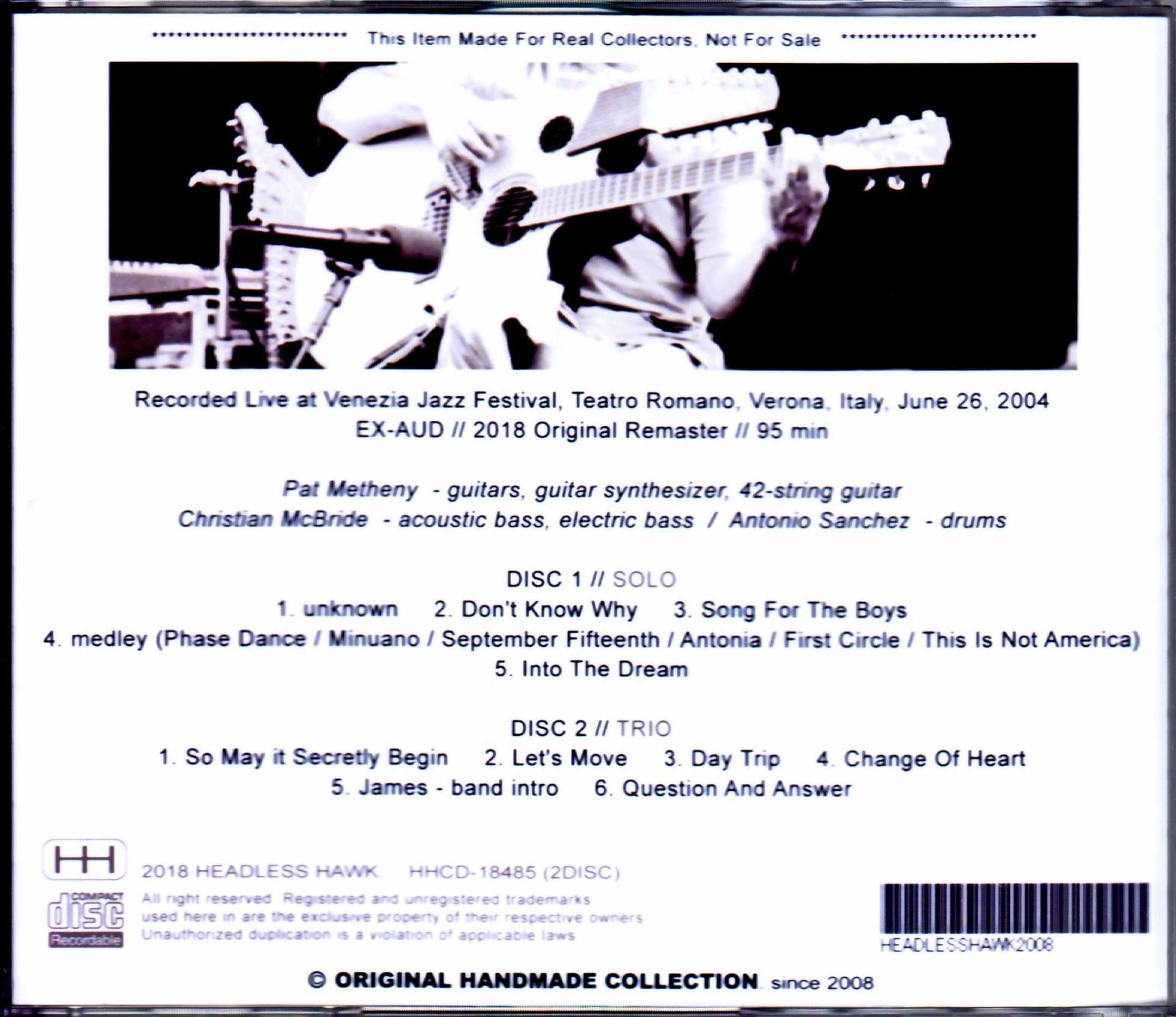 The trio of Metheny, McBride, and Sanchez, who later released the masterpiece “Day Trip” that represents contemporary guitar trio works, finally appears on stage for the first time, a famous performance at a jazz festival! ! ! This trio recorded a masterpiece in the studio called “Day Trip” in 2008, but this was preceded by their first stage performance four years earlier, on June 26, 2004 in Italy. A 2-disc set has arrived, complete recording of the best performance at the Venice Jazz Festival held in Verona, over an hour and a half, in the highest quality stereo sound with the label’s own careful mastering. ! ! ! Live at Venezia Jazz Festival,Teatro Romano,Verona,Italy June.26.2004 EX – AUD 2018 Original Remaster 95 min Disc 1 Solo 1. Unknown 2. Don’t Know Why 3. Song for the Boys 4. Medley (Phase Dance / Minuano / September Fifteenth / Antonia / First Circle / This is Not America) 5. Into the Dream Disc 2 Trio 1. So May it Secretly Begin 2. Let’s Move 3. Day Trip 4. Change of Heart 5. James – Band intro 6. Question and Answer Pat Metheny – Guitars Christian McBride – Bass Antonio Sanchez – Drums