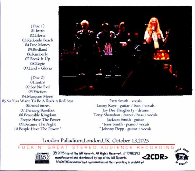 This high-quality digital PCM stereo audience recording captures the second day of a two-day concert at the London Palladium from her latest European tour in October 2025! Patti Smith fell ill during her Italian tour in December 2023, causing her to cancel her Bologna and Venice shows. Despite concerns about her condition, she made a spectacular comeback in Brooklyn at the end of the year. Since her February 2024 New York performance, she has been touring with both the Patti Smith Group and the Patti Smith Quartet. In April 2025, she returned to Japan for the first time in nine years as part of her latest project with the contemporary sound art collective, Soundwalk Collective. This release features the second day of a two-day concert at the London Palladium, a theater located on Argyle Street in Soho, London, from her latest tour, recorded in high-quality stereo audience recording! This direct digital transfer from the digital PCM master recording delivers crisp, clear vocals and exceptionally well-balanced, deep, and clear sound throughout. This live performance features Patti Smith and Her Band, featuring her son Jackson Smith on guitar, Tony Shanahan on bass and keyboards, Lenny Kaye on guitar and bass, and Jaydee Daugherty on drums. This concert celebrated the 50th anniversary of her debut album, “Horses,” released in 1975. The first set featured the entire album, followed by a medley of Television covers with the band (minus Patti). Patti returned to the stage for a setlist that included “Peaceable Kingdom,” a tribute to the Palestinian people. The encore featured her daughter Jesse Smith on piano and Johnny Depp on guitar. London Palladium,London,UK October 13,2025 (Disc 1) 01.Intro 02.Gloria 03.Redondo Beach 04.Free Money 05.Birdland 06.Kimberly 07.Break It Up 08.Elegie 09.Land ~ Gloria (Disc 2) 01.Iintro 02.See No Evil 03.Friction 04.Marquee Moon 05.So You Want To Be A Rock n Roll Star 06.band intros 07.Dancing Barefoot 08.Peaceable Kingdom ~ People Have The Power 09.Because The Night 10.People Have The Power * Patti Smith – vocals Lenny Kaye – guitar / bass / vocals Jay Dee Daugherty – drums Tony Shanahan – piano / bass / vocals Jackson Smith – guitar * Jesse Smith – piano / vocals * Johnny Depp – guitar / vocals