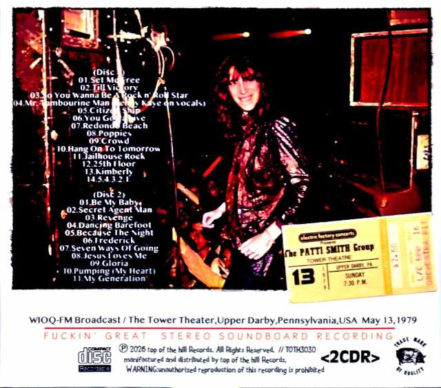 A high-quality stereo soundboard recording of their Pennsylvania concert in May 1979, just before their hiatus, has been released as an FM broadcast recording, and is now available in a newly remastered version! This FM broadcast recording captures a live performance held on May 13, 1979, four days before the release of their fourth masterpiece, “WAVE,” at The Tower Theater in Upper Derby, Pennsylvania, which has a capacity of approximately 3,100 people. The mix and balance are impeccable, and the sound quality is crystal clear. While several bootleg recordings have circulated since the analog era, they all suffered from pitch inaccuracies. Of course, this release has been carefully corrected, addressing pitch discrepancies caused by the master recording and the inconsistent positioning between songs. This long set, divided into two parts with an intermission, includes MC segments where the band members talk about living in Philadelphia (Upper Derby is part of the Philadelphia metropolitan area) for several years during their childhood, and mentions that their mother, friends, and family are in the audience. She also performed “Hang On To Tomorrow” from the musical “Annie” with an unexpected arrangement, a song that was reportedly one of her mother’s favorites at the time. The setlist featured songs from her then-new album “WAVE,” which was an even bigger hit than her previous work, including the singles “Frederick” and “Dancing Barefoot.” You can fully enjoy her superb performance in high-quality sound, including rare covers such as the single B-side “5-4-3-2-1,” a cover of Manfred Mann’s song that was not included on the album, and a cover of The Ronettes’ classic “Be My Baby”! WIOQ-FM Broadcast / The Tower Theater,Upper Darby,Pennsylvania,USA May 13,1979 (Disc 1) 01.Set Me Free 02.Till Victory 03.So You Wanna Be A Rock n’ Roll Star 04.Mr. Tambourine Man (Lenny Kaye on vocals) 05.Citizen Ship 06.You Gotta Live 07.Redondo Beach 08.Poppies 09.Crowd 10.Hang On To Tomorrow 11.Jailhouse Rock 12.25th Floor 13.Kimberly 14.5.4.3.2.1. (Disc 2) 01.Be My Baby 02.Secret Agent Man 03.Revenge 04.Dancing Barefoot 05.Because The Night 06.Frederick 07.Seven Ways Of Going 08.Jesus Loves Me 09.Gloria 10.Pumping (My Heart) 11.My Generation Patti Smith – vocals, guitar Lenny Kaye – guitar, bass, vocals Ivan Kral – guitar, bass, vocals Jay Dee Daugherty – drums Richard Sohl – keyboards