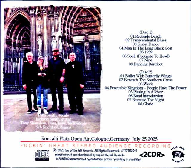 This high-quality digital PCM stereo audience recording captures Patti Smith’s performance in Cologne, Germany, from her latest tour in July 2025! Patti Smith fell ill during her December 2023 tour of Italy, causing her performances in Bologna and Venice to be canceled, but she made a spectacular comeback in Brooklyn at the end of the year. Since her February 2024 New York performance, she has been touring with both the Patti Smith Group and the Patti Smith Quartet. In April 2025, she returned to Japan for the first time in nine years as part of her latest project with the contemporary sound art collective Soundwalk Collective. This release features a live performance from her latest tour, held on July 25, 2025, at the outdoor stage at Roncalleyplatz in Cologne, Germany, completely captured in high-quality stereo audience recording! Digitally transferred directly from the digital PCM master, the vocals are crisp and clear, with each part exceptionally well-balanced and deep, providing a clear sound quality. The Patti Smith Quartet features her son Jackson Smith on guitar, Tony Shanahan on bass and keyboards, and Seb Rockford on drums. The setlist includes covers of Bob Dylan’s “Man in the Long Black Coat,” Steve Earle’s “Transcendental Blues,” the Smashing Pumpkins’ “Bullet with Butterfly Wings,” and Charlotte Day Wilson’s hit “Work.” The album also features a Black Sabbath rendition of “Beneath the Southern Cross” in tribute to Ozzy Osbourne! The full set, including the closing track “Gloria,” is included in its entirety. Roncalli Platz Open Air,Cologne,Germany July 25,2025 (Disc 1) 01.Redondo Beach 02.Transcendental Blues 03.Ghost Dance 04.Man In The Long Black Coat 05.1959 06.Spell (Footnote To Howl) 07.Nine 08.Dancing Barefoot (Disc 2) 01.Bullet With Butterfly Wings 02.Beneath The Southern Cross 03.Work 04.Peaceable Kingdom ~ People Have The Power 05.Pissing In A River 06.Band introduction 07.Because The Night 08.Gloria Patti Smith, vocals Jackson Smith, guitar Tony Shanahan, Bass, keys, back vocals Seb Rochford, drums