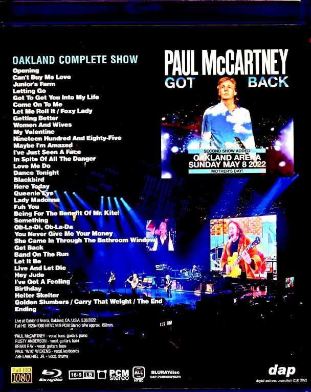 Paul McCartney’s latest “GOT BACK” tour was suddenly added to the Oakland performance on May 8th, and all the songs from the concert are recorded in full for about 2.5 hours! Must-see footage with the high-quality full HD quality that only Blu-ray can provide! Paul McCartney’s 2022 “GOT BACK” tour, which began for the first time in about three years, was suddenly added to the Oakland, California performance on May 8th, and it is now available for the first time on Blu-ray! From the opening SE before the concert starts to the background music after the encore, all the songs on the set list for that day are completely recorded with excellent angle shooting by a high-quality full HD camera that captures the entire stage from the central area of the arena! The concert kicked off with “Can’t Buy Me Love,” and included Beatles numbers such as “Getting Better” for the first time in 20 years, new arrangements of “You Never Give Me Your Money” and “She Came in Through the Bathroom Window,” as well as 70s Wings numbers and songs from his latest solo album “McCartney III” for the first time. In addition, the latest tour, which is full of highlights, such as “I’ve Got a Feeling” by a virtual duet with John Lennon on the screen, which was a first attempt on this tour, is recorded in high-definition high-definition quality. The greatness of the concert can only be understood by watching it not only with sound but also with images, such as highlight scenes from the Beatles movie “Get Back” released last year being projected on the screen and appearing waving the Ukrainian flag during the encore. Must-see live video from Paul McCartney’s latest tour in 2022, inspiring us with his energetic and active appearance despite soon turning 80! OAKLAND ARENA SUNDAY MAY 8 2022 Opening Can’t Buy Me Love Junior’s Farm Letting Go Got To Get You Into My Life Come On To Me Let Me Roll It / Foxy Lady Getting Better Women And Wives My Valentine Nineteen Hundred And Eighty-Five Maybe I’m Amazed I’ve Just Seen A Face In Spite Of All The Danger Love Me Do Dance Tonight Blackbird Here Today Queenie Eye Lady Madonna Fuh You Being For The Benefit Of Mr. Kite! Something Ob-La-Di, Ob-La-Da You Never Give Me Your Money She Came In Through The Bathroom Window Get Back Band On The Run Let It Be Live And Let Die Hey Jude I’ve Got A Feeling Birthday Helter Skelter Golden Slumbers / Carry That Weight / The End Ending Live at Oakland Arena, Oakland, CA. U.S.A. 5.08.2022 Full HD 1920×1080 NTSC 16:9 PCM Stereo time approx. 150min. PAUL McCARTNEY – vocals, bass, guitars, piano RUSTY ANDERSON – vocals, guitars, bass BRIAN RAY – vocals, guitars, bass PAUL “WIX” WICKENS – vocals, keyboards ABE LABORIEL JR. – vocals, drums