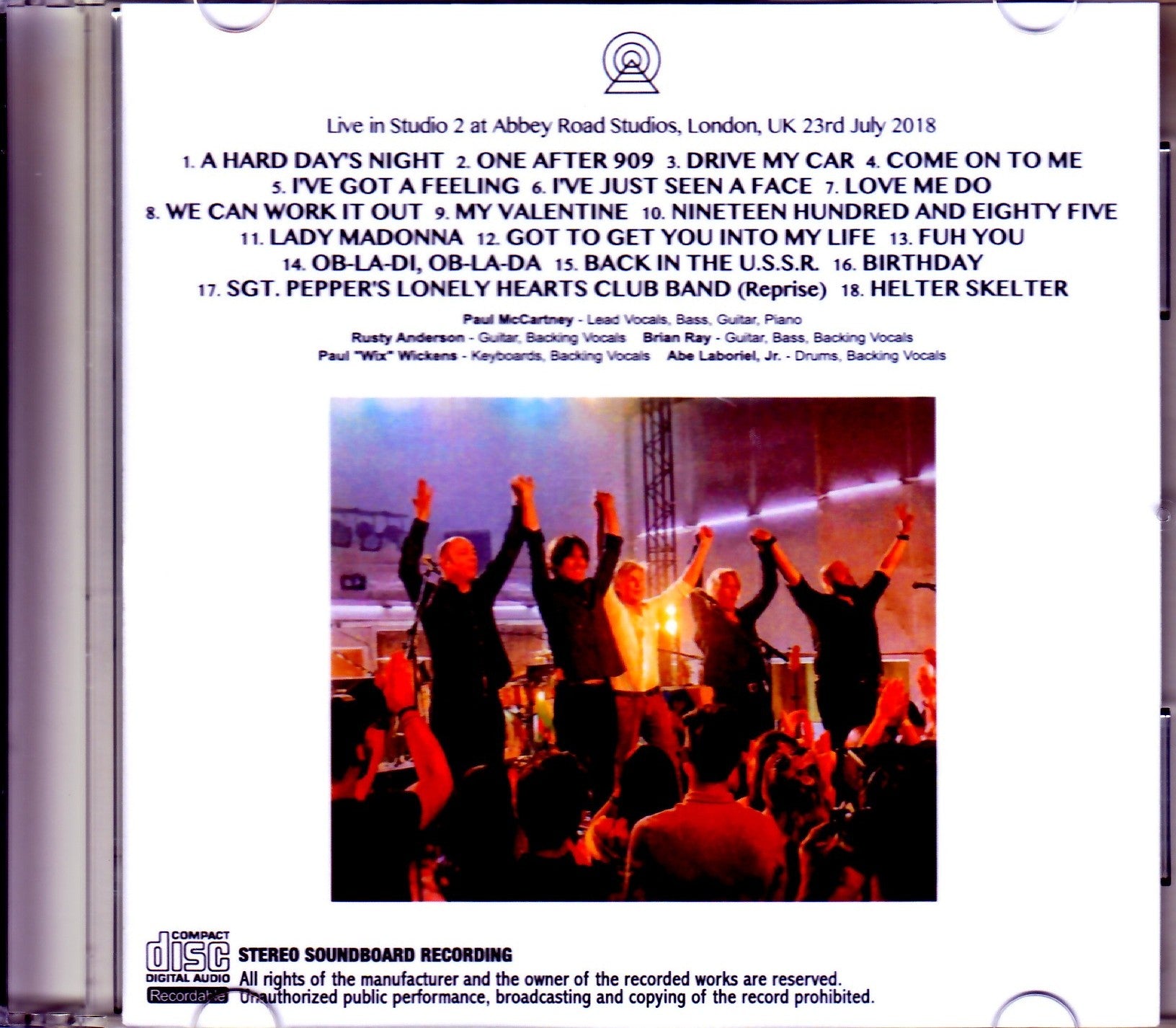 Promotional activities for the release of this album, which has already achieved great success, have been really energetic. For Paul, who is a workaholic by nature, it may be a bit of a show-off, but his exposure, which is conscious of today’s media, entertains us. Not only did he perform at the Cavern Club for the first time since 1999, but in June he appeared on the popular show “CARPOOL KARAOKE” and sang passionately in his car, and also held a surprise gig at a bar for the show. Until then. It is still fresh in my memory that the songs from the new album “EGYPT STATION” were performed there for the first time and became a hot topic. In addition, Paul will also record special gigs for music distribution services in July. Now that the new album has been released, it is being distributed to promote it. That said, the only song from “EGYPT STATION” is “Fuh You” and the rest are classic songs from yesteryear, which makes it easy to understand and seems like it’s for distribution. Songs such as “One After 909” and “Got To Get You Into My Life” can be said to be song selections unique to a gig, as was the case at Budokan three years ago, and in fact, the “FRESHEN UP” tour that just took place on Sunday. It was not played on the first day. It can be said that it is a generous gig sound source like the gig video released at Grand Central Station released this time, but unlike the time at the station, this gig was held in July, so the opening song “A Hard Day’s Night”, Paul’s voice is obviously not in his best condition, but after that, the engine is at full throttle, so it’s a relief. Although music distribution services seem to have become quite popular these days, it is true that just distribution is not enough. Young people might be satisfied with that, but for us, it’s not (lol). That’s something I want to have on record or listen to on record. Even more so if it becomes a stereo sound board recording that captures the gig. This item is in response to the voices of such enthusiasts. Perhaps due to the distribution system, the overall feel is net-like, especially the cymbals’ stand-out feel, which is softened by equalization. We would like to hear that as well. Since it was recorded in July, I think it’s a little different from the item that would be perfect for a performance in Japan like Central Station, but it’s still a stereo soundboard recording of the gig that Paul recorded for distribution. It’s fascinating to be able to listen to it easily. Live in Studio 2 at Abbey Road Studios, London, UK 23rd July 2018 STEREO SBD (54:57) 1. A Hard Day’s Night 2. One After 909 3. Drive My Car 4. Come On To Me 5. I’ve Got a Feeling 6. I’ve Just Seen a Face 7. Love Me Do 8. We Can Work It Out 9. My Valentine 10. 1985 11. Lady Madonna 12. Got to Get You Into My Life 13. Fuh You 14. Ob -La-Di, Ob-La-Da 15. Back in the U.S.S.R 16. Birthday 17. Sgt. Pepper’s Lonely Hearts Club Band (Reprise) 18. Helter Skelter STEREO SOUNDBOARD RECORDING