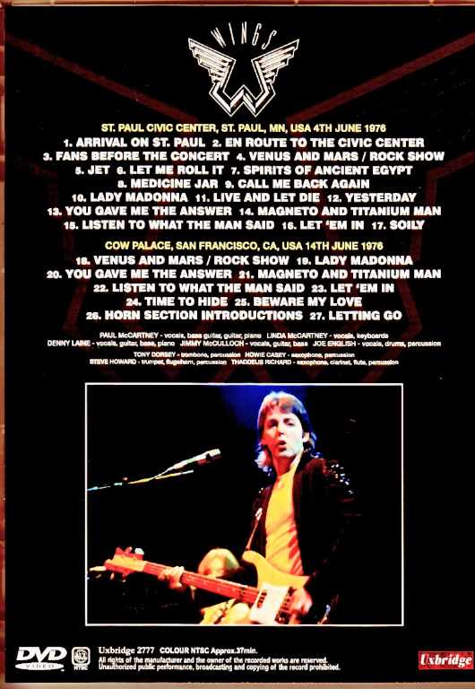 The June 4th St. Paul concert from the 1976 “Over America Tour,” previously known as a rare 8mm video, has been released on DVD in a state-of-the-art upgraded version. This footage was originally filmed by a fan from the front row using an 8mm video camera, and its impact, including close-ups, is of astonishing quality. This new title features a 4K scan of that master footage, newly imported and edited, allowing viewers to see even the finest details. It also captures moments such as staff members bringing chairs from the wings as an acoustic song begins, and the audio has been meticulously synchronized with an audience source from the same day, resulting in a highly polished production. As a bonus, 8mm footage from the first night of the Cow Palace concert 10 days later has also been added. Although it is less than 10 minutes long and filmed from a distance, the 4K scan has also resulted in sharp image quality, making it a valuable historical document worth watching for fans, totaling 37 minutes. 1. Arrival On St. Paul 2. En Route To The Civic Center 3. Fans Before The Concert 4. Venus And Mars / Rock Show 5. Jet 6. Let Me Roll It 7. Spirits Of Ancient Egypt 8. Medicine Jar 9. Call Me Back Again 10. Lady Madonna 11. Live And Let Die 12. Yesterday 13. You Gave Me The Answer 14. Magneto And Titanium Man 15. Listen To What The Man Said 16. Let’ Em In 17. Soily at St. Paul Civic Center, St. Paul, MN, USA 4th June 1976 18. Venus And Mars / Rock Show 19. Lady Madonna 20. You Gave Me The Answer 21. Magneto And Titanium Man 22. Listen To What The Man Said 23. Let’ Em In 24. Time To Hide 25. Beware My Love 26. Horn Section Introductions 27. Letting Go at Cow Palace, San Francisco, CA, USA 14th June 1976 Audience Shot.: COLOR NTSC Approx.37min.