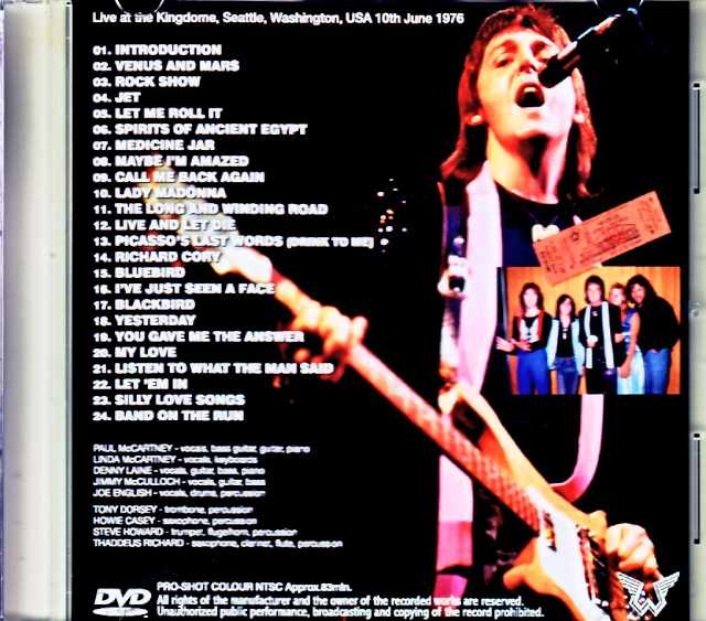 The now-defunct Seattle Kingdome, opened in March 1976 as a state-of-the-art venue, rivaling the Pontiac Silverdome as a popular venue for supergroups of the time. Led Zeppelin was a prime example, and the release of the definitive soundboard album “SEATTLE 1977,” based on footage of their 1977 live performance, is still fresh in our memory. As evidenced by the pro-shot footage from which their soundtrack was based, the Kingdome was capable of accommodating over 60,000 people during concerts, and was equipped with a cutting-edge video system that projected concert footage onto in-venue screens. Wings was the first rock group to take advantage of the Kingdome’s cutting-edge facilities and capacity for large audiences. In fact, Wings performed the Kingdome’s first rock concert (on June 10th), establishing its reputation as a large venue for major acts to hold concerts in Seattle. Speaking of Kingdom and Wings, the film “ROCKSHOW” from their 1976 Over America tour is also reminiscent. Because the opening track featured a performance of “Venus And Mars / Rock Show” at the Kingdom, and because it was initially touted as being recorded at the same venue, it was generally assumed to be a film filmed at the Kingdom. However, over the past 20 years, research by music enthusiasts has revealed that there were actually only four Kingdom takes, with the majority of the footage being recorded at the LA Forum on the final day of the tour. However, due to the aforementioned reasons, there is footage of Wings’ performance at the Kingdom that is separate from “ROCKSHOW.” This footage was used for the screen on this day. This footage was leaked in the 1990s, but because “ROCKSHOW” was synonymous with Kingdom at the time, it was simply assumed to be an outtake from the “ROCKSHOW” performance. However, while “ROCKSHOW” was actually recorded on film, the screen footage was recorded on videotape. As a result, the filming route and image quality were completely different. And most importantly, it offered significant value by allowing viewers to see plenty of footage of the real Kingdom performance, which was scarce in “ROCKSHOW.” Unlike “ROCKSHOW,” however, this footage was not intended for public viewing; it was merely recorded for archival purposes. As a result, there was a major cut just as Jimmy McCulloch began his guitar solo on “Medicine Jar.” Furthermore, the timing of the videotape change unfortunately resulted in the entirety of “Yesterday” being omitted, which is unfortunate. The second half of the live performance was also omitted. Due to this recording condition, and the initial misconception that most of the footage would overlap with “ROCKSHOW,” this footage did not receive much attention despite being extremely valuable. What makes this footage so valuable is not only that it captures the genuine Kingdom performance, but also its high value as a documentary, showing the relaxed moments between songs that were largely cut out in “ROCKSHOW.” For example, Paul’s playful behavior after finishing “Lady Madonna.” Or Paul laughing hysterically with Denny Laine after finishing “Yesterday” (with Trevor Jones setting up the microphone behind them). Or, sitting and relaxing between songs in the acoustic set. Most of these relaxed scenes, typical of live performances, were apparently cut from the film. While “ROCKSHOW,” shot on film, had a generally darker impression, this video captures the brightness of the actual stage, a quality unique to video. As for the audio, it’s a video-feed soundboard, just like Zeppelin’s Kingdome. It’s well-known that “ROCKSHOW” completely replaced Linda and Denny’s backing vocals and even overdubbed cheers. Therefore, this version is valuable in that it conveys the rawness of an actual live performance without any replacements. While pro-shot footage has been familiar since the video era, as distribution diverged, it resulted in a proliferation of pale copies. In fact, this state seems more common today. However, this time, we have obtained an exclusive copy with minimal dubbing and vivid color tones, and have released it on DVD. As mentioned earlier, the original footage was not intended for public release, and the roughness of the 1970s video is notable. However, the image quality is certainly improved compared to previously available versions. Furthermore, this release does not simply include screen footage; rather, it adds footage of the pre-show at the Kingdome concert, as seen in the tour documentary “WINGS OVER THE WORLD,” to enhance the concert’s immersive feel. Furthermore, as a visual adjustment that will impress enthusiasts, additional footage of the Kingdome performance broadcast on the American news program “GOODNIGHT AMERICA” has been added. Of particular note is “Yesterday,” as this performance, unfortunately not captured on video, is fully captured here. This is shot from a completely different angle than the film “ROCKSHOW,” and a subtle overlap with the live footage of The Beatles’ “A HARD DAY’S NIGHT” adds a touch of elegance. The two songs at the end of the live performance were also played during “GOODNIGHT AMERICA,” but these were fragmented, like a news program. However, this careful editing resulted in the longest version of the Kingdome footage. In other words, it not only has an upper feel to the screen image itself, but it is a video item that conveys the true enthusiasm of the Kingdome show more than “ROCKSHOW.” There are probably many enthusiasts who don’t even know that news footage existed at the Kingdome in the first place. Therefore, this is the longest and best version that will definitely satisfy even enthusiasts who have been accustomed to watching it since the video era! Leaked pro shot with a different camera angle than the movie “Rockshow.” Upgraded source with more vivid colors than previously released. The missing t