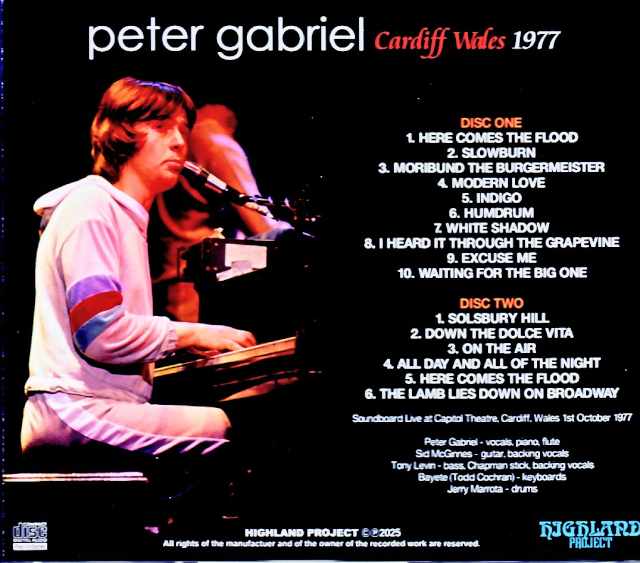 After leaving Genesis in 1977, Peter Gabriel embarked on his first solo tour, this first-ever recording of the Cardiff, Wales, performance on October 1st, is now available from a premium soundboard recording source leaked by a related source! While the band featured Robert Fripp on the first half of the tour in North America, he was replaced by Sid McGuinness on guitar for the European tour. The setlist has also been revised. In addition to songs from his first solo album, this soundboard recording of his first solo tour in 1977 also includes performances of Genesis’ “Downtown” and a cover of The Kinks’ “All Day and All of the Night”! Soundboard Live at Capitol Theatre, Cardiff, Wales 1st October 1977 disc one 01. Here Comes The Flood 02. Slowburn 03. Moribund The Burgermeister 04. Modern Love 05. Indigo 06. Humdrum 07. White Shadow 08. I Heard It Through The Grapevine 09. Excuse Me 10. Waiting For The Big One disc two 01. Solsbury Hill 02. Down The Dolce Vita 03. On The Air 04. All Day And All Of The Night 05. Here Comes The Flood 06. The Lamb Lies Down On Broadway Peter Gabriel – vocals, piano, flute Sid McGinnes – guitar, backing vocals Tony Levin – bass, Chapman stick, backing vocals Bayete (Todd Cochran) – keyboards Jerry Marrota – drums