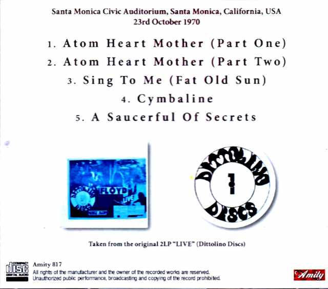TMOQ’s 2LP “LIVE (Dittolino Disc),” a classic bootleg release from the early 1970s, has been released directly on CD in master quality. This bootleg is a classic vinyl bootleg recording of the Santa Monica concert on October 23rd during the 1970 US tour, recorded with astonishing sound for its time. This mint-condition vinyl, now highly sought-after, has been meticulously digitized using state-of-the-art equipment for this release. While the CD faithfully reproduces the original release, and while the track order is far from a complete live performance, it does include most of the main performances, including the orchestral version of “Atom Heart Mother.” The string and mixed choir sections in “Atom Heart Mother” are particularly well-reproduced, delivering a rich, dense soundscape. Furthermore, the door opening and closing and the sound of heeled footsteps during “Cymbaline” are realistically reproduced, and the ethereal soundscapes in the first half of the following “Mystery” are truly spine-tingling. By the way, the momentary skip in this song is due to deterioration of the master tape, but please note that this has not been corrected and the vivid sound of the original has been recorded as is. Live at Santa Monica Civic Auditorium, Santa Monica, CA, USA 23rd October 1970 / Taken from the original 2LP “Live” (Dittolino Discs) 1. Atom Heart Mother (Part One) 2. Atom Heart Mother (Part Two) 3. Sing To Me (Fat Old Sun) 4. Cymbaline 5. A Saucerful Of Secrets
