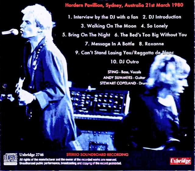 This 54-minute recording captures a live performance in Sydney, Australia on March 21st, from their Australian tour immediately following their memorable first visit to Japan in 1980. The recording is a stereo soundboard recording taken from a local FM broadcast. While not a complete recording due to being a broadcast source, the setlist is almost identical to their legendary first visit to Japan, and this performance features some of their most representative tracks from their first two albums, making it a nostalgic and official-quality recording for fans who remember that era. Live at Hordern Pavillion, Sydney, Australia 21st March 1980 : Stereo Soundboard Recording 1. Interview by the DJ with a fan 2. DJ Introduction 3. Walking On The Moon 4. So Lonely 5. Bring On The Night 6. The Bed’s Too Big Without You 7. Message In A Bottle 8. Roxanne 9. Can’t Stand Losing You – Reggatta de Blanc 10. DJ Outro Sting – Bass, Vocals / Andy Summers – Guitar / Stewart Copeland – Drums