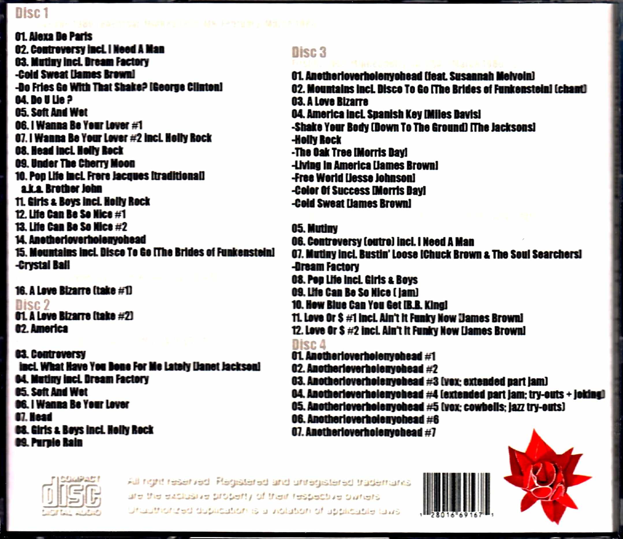 The 1986 tour included the Hit And Run tour, which was held locally in the United States, and the Parade Tour, which was held in Europe and Japan. However, after this, Prince decided to disband Revolution and proceed with another project, so it can be said that all the tours during this period had already completed their trials in the first half of 1986. This release is an epoch-making title that uses unreleased soundboard sound sources that did not exist in the past to unravel the whole story of the 1986 live performance. In addition, the previously released sound board of August 2nd is now available as a special edition, making it a great value and the best set. Parade In U.S.A. (4CD) Firstly, from February to March 1986, they were rehearsing for a live performance at First Avenue. Almost everything up to the parade tour is being tested on this day, but even more trials are being held here. In the performance that confirms the flow to Controversy and Mutiny, the title song of the unreleased album Dream Factory and George Clinton’s Do Fries Go With That Shake? are included, and the performance continues for more than 12 minutes. I’ve been trying to incorporate Holly Rock’s phrases into songs like I Wanna Be Your Lover and Head, Girls & Boys, and the jams are very funky and interesting. In the second half of Mountains, Crystal Ball is sung in an echoing manner, creating a mysterious Middle Eastern-style arrangement. And you can enjoy the wonderful American performance with a sense of speed on the sound board. And on the subsequent Disc 2 and Disc 3, the sound board sound source of First Avenue in 1986 will appear for the first time. Unfortunately, it is not complete, but since the sound quality is still a sound board, sounds that you have never heard before will jump in, and you should be able to make new discoveries. America incorporates phrases from a lot of songs, but the bass is especially bouncy, giving the impression of a different mix. After the live show, there are rehearsal recordings from the Hit And Run tour, including a funky, must-listen version of Life Can Be So Nice, and Prince singing BB King’s How Blue Can You Get with the band. It is also noteworthy that they are doing so. In addition, in Love Or Money, the horn phrase of Ain’t It Funky Now promotes the funkiness, and Anotherloverholeyohead plays especially carefully, following Prince’s instructions, funky cutting, and adding jazzy horn phrases, and further I’m trying to develop my playing. Disc 1 First Avenue 1986 rehearsal, Minneapolis, MN, USA February/March 1986 01. Alexa De Paris 02. Controversy incl. I Need A Man 03. Mutiny incl. Dream Factory -Cold Sweat [James Brown] -Do Fries Go With That Shake? [George Clinton] 04. Do U Lie ? 05. Soft And Wet 06. I Wanna Be Your Lover #1 07. I Wanna Be Your Lover #2 incl. Holly Rock 08. Head incl. Holly Rock 09. Under The Cherry Moon 10. Pop Life incl. Frere Jacques [traditional] a.k.a. Brother John 11. Girls & Boys incl. Holly Rock 12. Life Can Be So Nice #1 13. Life Can Be So Nice #2 14. Anotherloverholenyohead 15. Mountains incl Disco To Go [The Brides of Funkenstein] -Crystal Ball Parade Tour rehearsa #1 Unknown location 1986 : 16. A Love Bizarre (take #1) Disc 2 01. A Love Bizarre (take #2) 02. America First Avenue, Minneapolis, CA, USA 3 March 1986 03. Controversy incl. What Have You Done For Me Lately [Janet Jackson] 04. Mutiny incl. Dream Factory 05. Soft And Wet 06. I Wanna Be Your Lover 07. Head 08. Girls & Boys incl. Holly Rock 09. Purple Rain Disc 3 01. Anotherloverholenyohead (feat. Susannah Melvoin) 02. Mountains incl. Disco To Go [The Brides of Funkenstein] (chant) 03. A Love Bizarre 04. America incl. Spanish Key [ Miles Davis] -Shake Your Body (Down To The Ground) [The Jacksons] -Holly Rock -The Oak Tree [Morris Day] -Living In America [James Brown] -Free World [Jesse Johnson] -Color Of Success [Morris Day ] -Cold Sweat [James Brown] Parade Tour rehearsal #2 Unknown location April 1986 05. Mutiny 06. Controversy (outro) incl. I Need A Man 07. Mutiny incl. Bustin’ Loose [Chuck Brown & The Soul Searchers] -Dream Factory 08. Pop Life incl. Girls & Boys 09. Life Can Be So Nice (jam) 10. How Blue Can You Get [B.B. King] 11. Love Or $ #1 incl. Ain’t It Funky Now [James Brown] 12. Love Or $ #2 incl. Ain’t It Funky Now [James Brown] Disc 4 01. Anotherloverholenyohead #1 02. Anotherloverholenyohead #2 03. Anotherloverholenyohead #3 (vox; extended part jam) 04. Anotherloverholenyohead #4 (extended part jam; try-outs and joking) 05. Anotherloverholenyohead #5 (vox; cowbells; jazz try-outs) 06. Anotherloverholenyohead #6 07. Anotherloverholenyohead #7