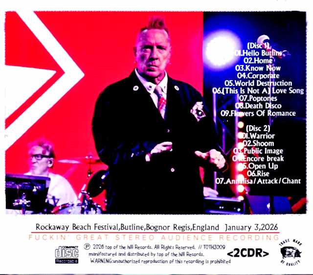 This is a complete recording of the band’s performance at Rockaway Beach Festival in January 2026, recorded in high-quality digital PCM, stereo, and audience quality! This is a complete recording of the band’s performance at Rockaway Beach Festival, held at Butlin’s Holiday Resort in Bognor Regis, England, on January 3, 2026, as part of their latest tour, “THIS IS NOT THE LAST TOUR,” which began in May 2025. Recorded directly from the digital PCM master, the vocals are loud and clear, with excellent balance across each part, a wide range, and outstanding clarity for powerful sound. The setlist encompassed John’s entire career, including early hits like “World Destruction,” his 1984 collaboration with Afrika Bambaataa and produced by Bill Laswell, “Death Disco,” and “Flowers of Romance.” The final track, a blistering medley of “Annalisa/Attack/Chant,” was also a revelation! John’s powerful vocals showed no signs of fading throughout the set. This tour marks the first tour for Lou Edmonds on guitar, Scott Firth on bass, and Mark Roberts, a longtime friend of Lou Edmonds’s who John admires, replacing Bruce Smith on drums. John also spoke about recording a new album with Mark, and as the tour title suggests, this was a truly captivating performance, showcasing his enthusiasm for the future! Rockaway Beach Festival,Butline,Bognor Regis,England January 3,2026 (Disc 1) 01.Hello Butlins 02.Home 03.Know Now 04.Corporate 05.World Destruction 06.(This Is Not A) Love Song 07.Poptones 08.Death Disco 09.Flowers Of Romance (Disc 2) 01.Warrior 02.Shoom 03.Public Image 04.Encore break 05.Open Up 06.Rise 07.Annalisa/Attack/Chant
