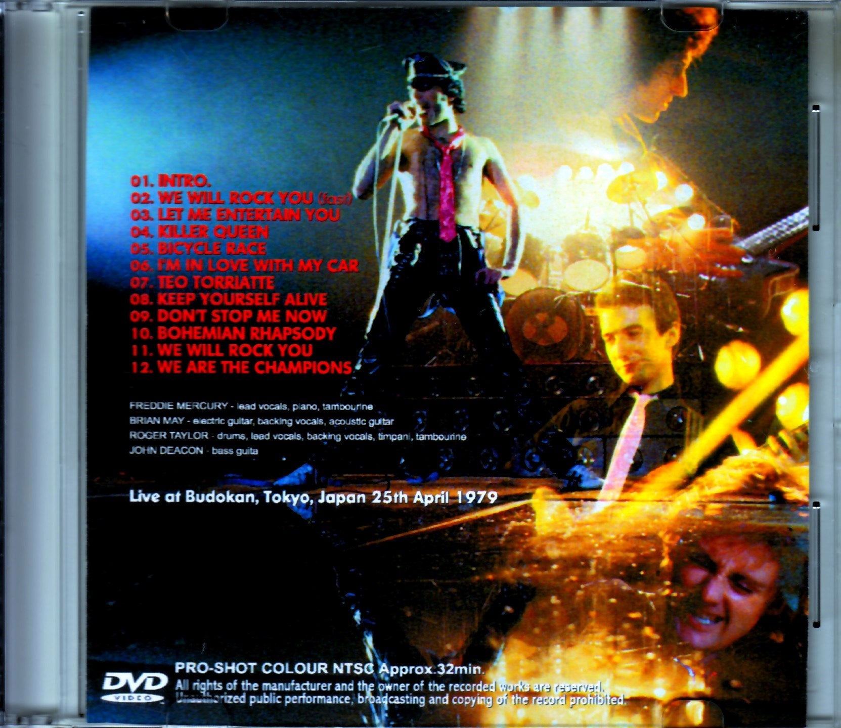 A collection of “The Live QUEEN Live at Budokan PART &”, which includes the Budokan performance on April 25th from the 1979 Japan tour accompanying “Jazz”. This day’s live video was broadcast in the early 1980s on a commercial TV station, about 15 minutes each, in two late-night broadcasts, some time after the actual live performance. The video was more famous in the past, but in 2002, a video title released on DVD from the video master, which is said to have been air-checked by enthusiasts at the time, appeared. The content created a sensational topic. A few years later, it was released under the title “PRIDE AND JOY”. This is an upgraded version that has been re-recorded from Video Master at “maximum transfer rate,” and has received high praise from enthusiasts as an item that allows you to enjoy a more beautiful screen than the MP version. This edition has been digitized again from the video master with the best equipment using current technology and techniques, added original menus that were not present in “PRIDE AND JOY”, and arranged the overall screen and sound, making it the highest quality currently available. We have created a definitive edition that we are proud of. The high-quality images and sounds are so high that some parts can even be used for official use, and the beautiful close-up scenes of Freddy will be captivating even if you are not a fan. It is a first-class video work that makes you want to thank the planning and staff who recorded Queen’s Japan performance during this period with multiple cameras, and it can be said to be a piece of work that Japan is proud of to Queen fans around the world. The editing, cuts, camera angles, everything is cool, and you can directly enjoy the charm of Queen at this time. Everyone will be moved by the wonderful chorus of “Hand in Hand” that brings the whole venue together as one. A supreme 32 minutes where you can relive the miraculous moment that echoed in Budokan 31 years ago with the best screen and audio. Live at Budokan, Tokyo, Japan 25th April 1979 PRO-SHOT(Best Q’ty Ever! from Original Masters) 1. Intro 2. We Will Rock You(fast) 3. Let Me Entertain You 4. Killer Queen 5. Bicycle Race 6. I’m In Love With My Car 7. Teo Torriatte 8. Keep Yourself Alive 9. Don’t Stop Me Now 10. Bohemian Rhapsody 11. We Will Rock You 12. We Are The Champions PRO-SHOT COLOR NTSC Approx. 32min.