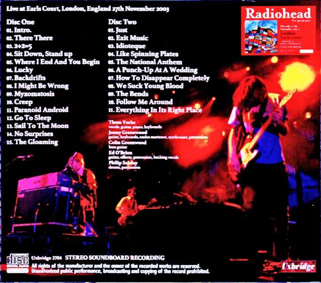 This 2-hour, 11-minute set captures the highlights of the 2003 UK tour following the release of “HAIL TO THE THIEF,” a live performance at Earl’s Court in London on November 27th, captured in full on a stereo soundboard from the FM on-air master. While this recording was originally broadcast in real time and has been in circulation for some time, it has been recently rediscovered and released on CD using the best masters. Unprocessed and unedited, it delivers a raw, powerful performance unmatched by an official live performance. The set, featuring 11 tracks from the album and many from “KID A” and “OK Computer,” is truly unique to this period, with “HAIL TO THE THIEF” tracks such as “Backdrifts,” “A Punchup at a Wedding,” and “We Suck Young Blood” appearing exclusively on this tour. Three months prior to this, they performed at Summer Sonic, and the following April 2024, they held four solo shows, so they also performed live in Japan around this time, and this album is reminiscent of their performances from that time, making it a must-listen for fans who remember that time. Live at Earls Court, London, UK 27th November 2003 : Stereo Soundboard Recording Disc 1 : 1. Intro. 2. There There 3. 2+2=5 4. Sit Down, Stand up 5. Where I End And You Begin 6. Lucky 7. Backdrifts 8. I Might Be Wrong 9. Myxomatosis 10. Creep 11. Paranoid Android 12. Go To Sleep 13. Sail To The Moon 14. No Surprises 15. The Gloaming Disc 2 : 1. Just 2. Exit Music 3. Idioteque -encore #1- 4. Like Spinning Plates 5. The National Anthem 6. A Punch-Up At A Wedding 7. How To Disappear Completely -encore #2- 8. We Suck Young Blood 9. The Bends 10. Follow Me Around 11. Everything In Its Right Place