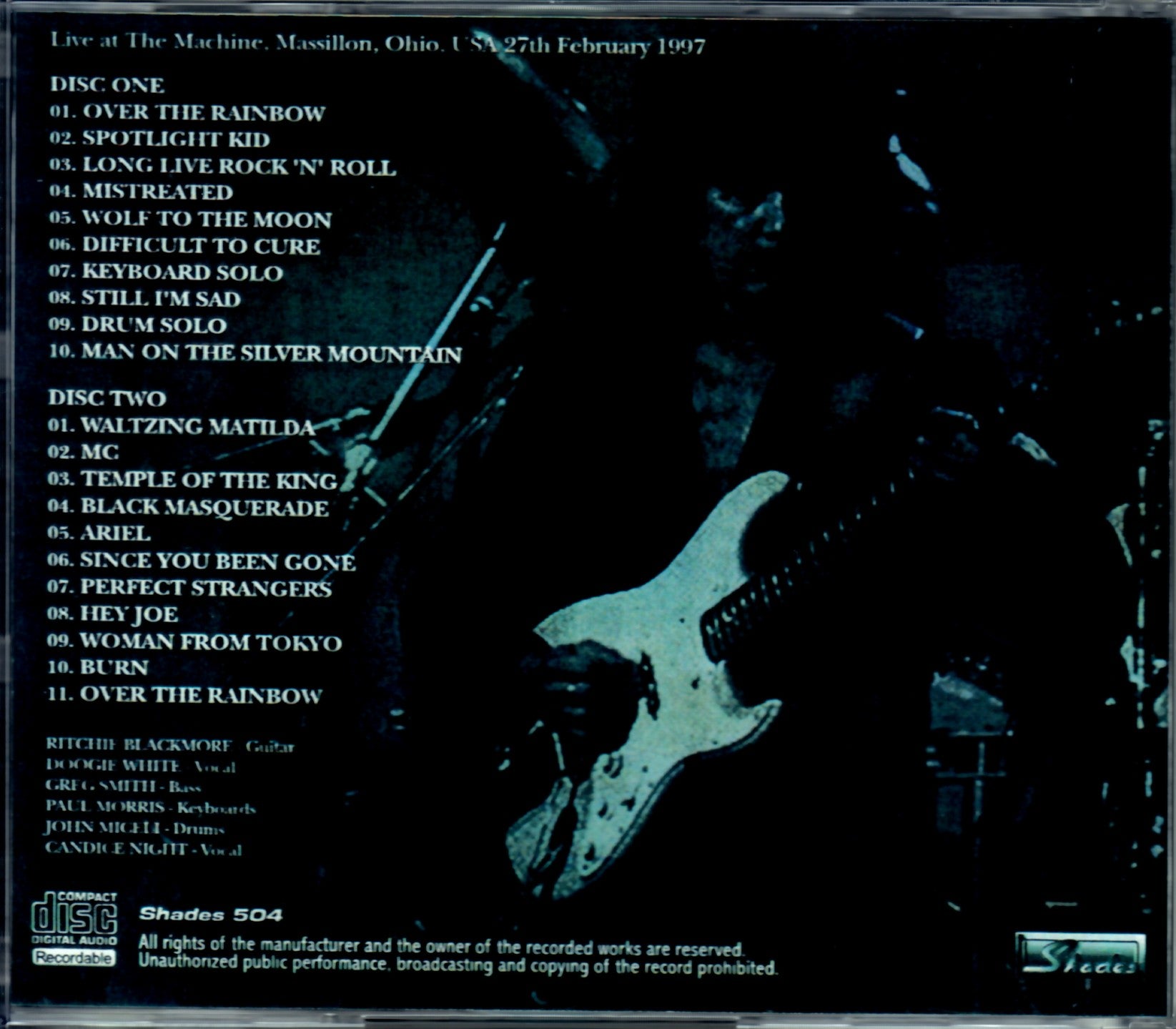 In 2016, it was finally announced that he would perform live as Ritchie Blackmore’s Rainbow, and while it was attracting a lot of attention, from the US tour accompanying the release of “STRANGER IN US ALL” in 1997, the first performance at Massillon, Ohio, on February 27th, was the first of its kind at the time. Complete recording from the original audience source created from the master provided by a good recording person. The live performance opened with “Over The Rainbow” as usual, but on this day there was a turbulent start with Dougie starting the song incorrectly with “Spotlight Kid”, but after that the show featured the familiar “Black Night” and traditional songs. The set that was unique to this period, such as “Long Live Rock ‘n’ Roll” and the revived masterpiece “Mistreated”, is sure to attract attention. And in the encore, the lyrics were changed (to reflect the news at the time) from “Hey Joe” to “Woman From Tokyo” and then “Burn” and the end. Disc 1 : 1. Over The Rainbow 2. Spotlight Kid 3. Long Live Rock ‘n’ Roll 4. Mistreated 5. Wolf To The Moon 6. Difficult To Cure 7. Keyboard Solo 8. Still I’m Sad 9. Drum Solo 10. Man On The Silver Mountain Disc 2 : 1. Waltzing Matilda 2. MC 3. Temple Of The King 4. Black Masquerade 5. Ariel 6. Since You Been Gone 7. Perfect Strangers 8. Hey Joe 9. Woman From Tokyo 10 Burn 11. Over The Rainbow [Live at The Machine, Massillon, Ohio, USA 27th February 1997] Ritchie Blackmore – Guitar / Doogie White – Vocal / Greg Smith – Bass / Paul Morris – Keyboards / John Miceli – Drums / Candice Night – Vocal