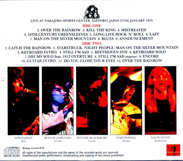 Known as one of the greatest tragedies in the history of Western music in Japan, the “1978 Sapporo” concert. The legendary recording that allows you to fully experience this historic night of events has been polished up. A newly assembled, top-of-the-line updated version is now available. That “night of events” is, of course, “January 27, 1978: Sapporo concert.” Fans familiar with Rainbow’s history will know that this day was completely different from a normal concert. In a venue packed with approximately 5,000 people, a stampede occurred as the audience rushed to the front of the stage as soon as the show began, resulting in the death of a female university student. This work is a complete audience recording that permanently preserves the entire incident. Three recordings of this day are currently known, and have given rise to numerous previously released works. This work is a full live album produced by making full use of these three recordings. To explain its contents, let’s first look back at the source material. Three recordings that documented the scene of the tragedy RECORDER 1: The traditional top-of-the-line recording The main sound source of this work. This is a traditional, renowned recording that has played a leading role in numerous masterpieces such as “MISCONDUCT,” “COLD WINTER,” and “FREEZING BLOW.” While not flashy, it is consistently stable and well-balanced, making it the best overall. RECORDER 2: Sub-recording for supplementation. A slightly distant, mid-range-heavy recording with a distinctive character. In this work, it is only used to supplement “16th Century Greensleeves” and “Long Live Rock ‘n’ Roll.” RECORDER 3: A legendary recording with a spine-chilling sense of being there. This source makes up the majority of the supplementary parts in this work. This recording has also been known as the traditional work “AN ACT OF GOD” and “COLD WINTER (partially),” and although it includes surrounding voices, it is also the only record of the encore part. As it is the scene of tragedy, the surrounding conversations are also documented. This is a top-of-the-line release newly reassembled from the original master. While Discs 1 and 2 of the previous release, “FREEZING BLOW,” also centered around “RECORDER 1,” this release returns to the original master and has been completely rebuilt by “GRAF ZEPPELIN.” The difference in sound is indeed clear. For example, the previous release had a weakness in its soundstage, which was shifted to the right, and the thin sound image due to the reduction of high and low frequencies. In this release, precise phase correction has resulted in a precise center positioning, and the frequency range has been restored to its original state, transforming it into a powerful sound with thickness and sound pressure. Tape-derived distortions have also been carefully corrected. On the other hand, there is a slight tendency for hiss noise to increase, but this is a result of elements that were previously cut (along with the performance sound) returning to their original state. In terms of sound quality, it is rather natural, and the structure of the sound has become thicker. This highest quality “RECORDER 1” is utilized to the fullest extent, and parts that cannot be filled in due to omissions or tape changes are supplemented with “RECORDER 3.” The setup prioritizes sound quality, using “RECORDER 2” only for parts of “16th Century Greensleeves” and “Long Live Rock ‘n’ Roll,” which cannot be handled by either system. In particular, the encore is entirely handled by “RECORDER 3,” the only recording available. The performance and the chaos are documented—a complete record of a historic night. This top-of-the-line natural sound captures a night that forever changed the history of Japanese rock concerts. However, while the accidents often take on a life of their own, the performance itself was also a magnificent and fulfilling one. Ronnie James Dio’s vocals were in top form that night, and he delivered an incredibly soaring vocal performance from “Kill The King.” Ritchie Blackmore unleashed magical phrases from the intro of “Mistreated,” and his solo in the middle section was outstanding, even by the end of this tour. The setlist was also different from usual, with “Long Live Rock ‘n’ Roll” performed after “16th Century Greensleeves.” Then, in the middle of “Man On The Silver Mountain,” the staff made an announcement in Japanese, acknowledging the seriousness of the situation. Their sincere voices were clearly recorded as they appealed to the audience, saying, “We cannot continue the show if things continue like this,” and “Ritchie does not like this kind of commotion.” After the flow of music was interrupted, Ritchie calmed the atmosphere with a classical performance based on Bach, leading into the 17-minute “Catch The Rainbow.” The grand suite that followed, including “Starstruck,” “Night People,” and a reprise of “Man On The Silver Mountain,” conveyed the band’s determination to recover from the chaos of the first half. The second half of the live performance was extremely fulfilling, and Cozy Powell’s drum solo in “Still I’m Sad” was wonderfully powerful. After the main set ended, there was a fairly long encore break (presumably a last-minute decision on whether or not to do an encore), and Ritchie calmed the venue with a serious guitar intro, before “Do You Close Your Eyes” exploded wildly to conclude the show. This album allows you to trace the entire sequence of events, right up to the encore, through a combination of three different recordings. A night of incredible ensemble playing, the epitome of British hard rock, yet also a night of utter chaos. This live album vacuum-packs every moment of that event. This is a top-of-the-line updated version that makes full use of the three legendary recordings and