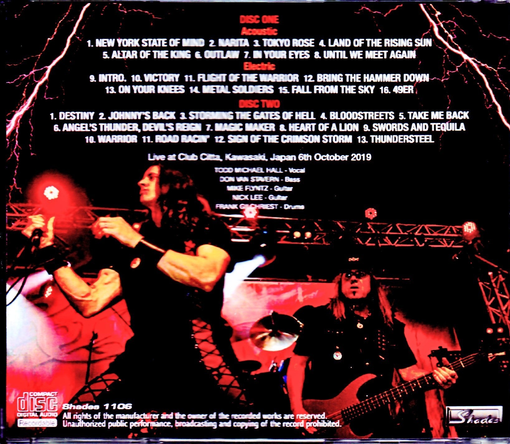 RIOT’s latest Japan tour is also attracting attention with its first acoustic set. The original recording containing the latest stage will be released. The masterpiece live album “KAWASAKI 2019 1ST NIGHT” will also be released at the same time, but this work is the second. This is a masterpiece audience recording of the “October 6, 2019: Club Citta Kawasaki” performance. As many of you may already know, this visit to Japan is only for two performances in Kawasaki, and the favorite is this second day. It was a show with more volume than the first day. This may be a bit sudden, but let’s organize the contents of the set. [Part 1: Acoustic]・Tokyo Rose “ROCK CITY”/Narita “NARITA”/In Your Eyes “NIGHTBREAKER”・FIRE DOWN UNDER: Altar of the King/Outlaw・UNLEASH THE FIRE: Land of the Rising Sun/Until We Meet Again [Part 2: Electric] ●Guy Speranza era (4 songs)・ROCK CITY: Warrior・NARITA: 49er/Road Racin’・FIRE DOWN UNDER: Swords and Tequila ●Tony Moore era (8 songs)・THUNDERSTEEL :Flight of the Warrior/Johnny’s Back/Bloodstreets/Sign of the Crimson Storm/Thundersteel・THE PRIVILEGE OF POWER: On Your Knees/Metal Soldiers/Storming the Gates of Hell ●Mike DiMeo era (2 songs)・NIGHTBREAKER: Destiny/ Magic Maker●Todd Michael Hall era (6 songs)・UNLEASH THE FIRE: Bring the Hammer Down/Fall From the Sky/Take Me Back・ARMOR OF LIGHT: Victory/Angel’s Thunder, Devil’s Reign/Heart of a Lion… And it looks like this. The show consisted of two parts, the first part = acoustic set / the second part = electric set. It’s hard to understand how it’s different from the first day if you just look at this, so let’s take a closer look at the differences between the two days. ●Acoustic (first day) → Electric (second day)・Bloodstreets/Take Me Back ●Electric (first day)→Acoustic (second day)・Outlaw/Altar of the King ●Songs only on the second day・Narita (acoustic)/ Sign of the Crimson Storm (Electric) …and it looks like this. Two songs have been replaced with acoustic/electric, and two more songs have been added. I’m especially happy about “Narita,” which opens the acoustic set. You can enjoy the unplugged version of the famous song that fascinated the Japanese people along with “Warrior”. Although the mood is different from the electric tension, it is still a masterpiece. A wonderful version that highlights that soaring melody. The arrangement that flows from there into the lighthearted “Tokyo Rose” is also great. Furthermore, the famous songs “Outlaw” and “Altar of the King” from “FIRE DOWN UNDER” are also included in the first part, and the color of the entire acoustic set has become much more like the initial color. The unplugged versions of “Bloodstreets” and “Take Me Back” on the first day are also great, so I can’t give them a thumbs up, but I feel like this work has a more focused flow. The sound that recorded such a show is also exquisite. This is the original master for this work (the first day’s recording artist was a different person), which was handed down directly from Mr. “Western Japan’s Strongest Taper”, who is second to none when it comes to recording HR/HM, and the bass with unclear lines is booming. The roaring sound is the same as the first day, but the crispness of the mid and high tones that do not mix with the base is amazing. Each sound of the drums and the interaction between the twin guitars is crisp and three-dimensional. When it comes to vocals, there is zero distance, and both whispers and high shouts are recorded very beautifully. If the bass sound was clear, it would have been a superb soundboard-level recording… However, even if it is a base, it more than fulfills its role as a foundation, and it stands out clearly in an acoustic set. As the “strongest” man would have expected, it was so clear that even when listening with headphones, there was no hall sound at all, and it seems physically impossible to record the bass more clearly than this. On the second day, the number of songs increased significantly, and even an unplugged version of the famous song “Narita” was released. It is a masterpiece of a live album that captures the full show with a wonderful (and honest to the scene) sound. The first day where you can listen to the acoustic versions “Bloodstreets” and “Take Me Back” is also hard to throw away, but overall this work will be the best masterpiece. One of the representative works of the 2019 performance in Japan, which showed a new charm. Live at Club Citta, Kawasaki, Japan 6th October 2019 PERFECT SOUND(from Original Masters) Disc 1 (79:04) Acoustic 1. New York State of Mind (Billy Joel song) 2. Narita 3. Tokyo Rose 4. Land of the Rising Sun 5. Altar of the King 6. Outlaw 7. In Your Eyes 8. Until We Meet Again Electric 9. Intro. 10. Victory 11. Flight of the Warrior 12. Bring the Hammer Down 13. On Your Knees 14. Metal Soldiers 15. Fall From the Sky 16. 49er Disc 2 (73:13) 1. Destiny 2. Johnny’s Back 3. Storming the Gates of Hell 4. Bloodstreets 5. Take Me Back 6. Angel’s Thunder, Devil’s Reign 7. Magic Maker 8. Heart of a Lion 9. Swords and Tequila 10. Warrior 11. Road Racin’ 12. Sign of the Crimson Storm 13. Thundersteel Todd Michael Hall – Vocal Don Van Stavern – Bass Mike Flyntz – Guitar Nick Lee – Guitar Frank Gilchriest – Drums