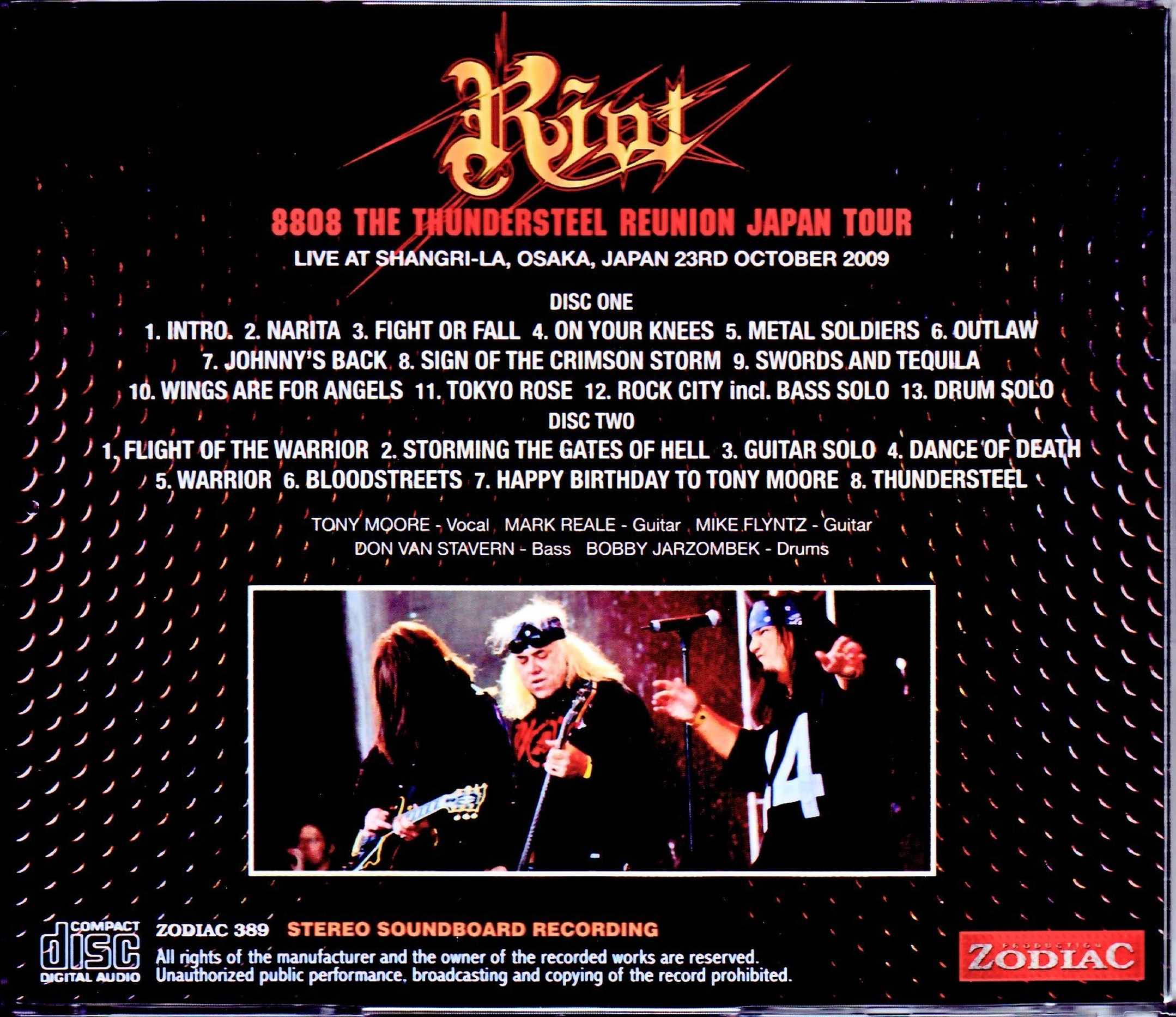 A shocking incident!!! The 2009 “THE THUNDERSTEEL REUNION JAPAN TOUR” was Marc Leary’s last visit to Japan, 20 years after his legendary first visit to Japan. The super best stereo sound board recording was unexpectedly discovered! Moreover, all three performances are completely leaked. It has been decided to release the permanent trilogy at once! Of the three such incidental works, this work will be performed on the first day “October 23, 2009: Osaka Shangri-La”. It is the super best stereo sound board recording. This week, three performances will be released at the same time, so be sure to check the schedule one by one to avoid confusion.・October 23rd: Osaka Shangri-La ←★This work★ ・October 24th “KAWASAKI 2009 1st Night” ・October 25th “KAWASAKI 2009 2nd Night” All 3 performances. This is the first time in 19 years since 1990 that the five members, including Tony Moore, Don Van Stavan, and Bobby Jarzombek, have come to Japan. The Osaka performance of this work was a concert on the first day. Japanese metal heads are excited as this reunion brings back the legendary first visit to Japan. At that time, it was partially broadcast on radio, but this work is completely different. This is a complete soundboard that was brought to us through our own route and is believed to have been leaked by the people involved. Of course, it is the world’s first public release master, which is a secret that is not available on the internet or elsewhere. Moreover, the quality is superb. In terms of audio, it’s “completely official grade”, but it’s even more amazing. It is a completely unprocessed type that connects directly to the mix table, and all performances and singing voices are directly connected to the brain, down to the single note. There is also the nostalgic “RIOT IN JAPAN: LIVE!!” when it comes to Japan performances sung by Tony Moore, but there is no such unnatural processing and the PA sound is exposed. The vocals are at the level of a single breath, and the guitar and bass are extremely detailed, right down to the sound of fingerprints rubbing against the strings. As a direct connection system, you can hardly hear the cheers and the sense of being at the scene cannot be expected, but instead you can enjoy the tremendous sense of synchronization that makes you completely one with the band. “THE THUNDERSTEEL REUNION” drawn with such a sound is already overwhelming. “RIOT IN JAPAN: LIVE!!” came up as the story progressed, so let’s compare and organize the sets. Guy Speranza era (6 songs)・ROCK CITY: Tokyo Rose/Rock City/Warrior ・NARITA: Narita・FIRE DOWN UNDER: Outlaw/Swords and Tequila (★) Tony Moore era (11 songs)・THUNDERSTEEL: Fight or Fall (★) / Johnny’s Back / Sign of the Crimson Storm (★) / Flight of the Warrior / Bloodstreets (★) / Thundersteel (★)・THE PRIVILEGE OF POWER: On Your Knees / Metal Soldiers / Storming the Gates of Hell (★ )/Dance of Death (★)・IMMORTAL SOUL: Wings Are for Angels (★) *Note: Songs marked with “★” cannot be heard on the official version “RIOT IN JAPAN: LIVE!!”. …and it looks like this. Only one song “Thundersteel” was broadcast from the Osaka performance, but the other soundboards are completely new. There are no songs from the Rhett Forrister era or the Mike DiMeo era, and there are killer songs from Tony himself and Guy Speranza’s era. It’s not just a collection of songs with great high notes, but it also includes Mark’s new song “Wings Are for Angels” from his posthumous album “IMMORTAL SOUL”, concentrating all of his works from Guy’s/Tony’s era. I am also giving back. Even in the history of RIOT, which has been full of twists and turns, it is the ultimate set that condenses the highlight era into one show. amazing. Too amazing. In recent years, RIOT’s official archive has progressed, but has there ever been such a strong soundboard album? The monumental “THE THUNDERSTEEL REUNION” is a superb soundboard trilogy that completely records Mark’s last visit to Japan. The first part is the Osaka edition. Live at Shangri-La, Osaka, Japan 23rd October 2009 STEREO SBD(from Original Masters) Disc 1 (63:42) 1. Intro 2. Narita 3. Fight or Fall 4. On Your Knees 5. Metal Soldiers 6. Outlaw 7 Johnny’s Back 8. Sign of the Crimson Storm 9. Swords and Tequila 10. Wings Are for Angels 11. Tokyo Rose 12. Rock City (incl. Bass solo) 13. Drum Solo Disc 2 (44:10) 1. Flight of the Warrior 2. Storming the Gates of Hell 3. Guitar Solo 4. Dance of Death 5. Warrior 6. Bloodstreets 7. Happy Birthday to Tony Moore 8. Thundersteel Tony Moore – Vocal Mark Reale – Guitar Mike Flyntz – Guitar Don Van Stavern – Bass Bobby Jarzombek – Drums STEREO SOUNDBOARD RECORDING