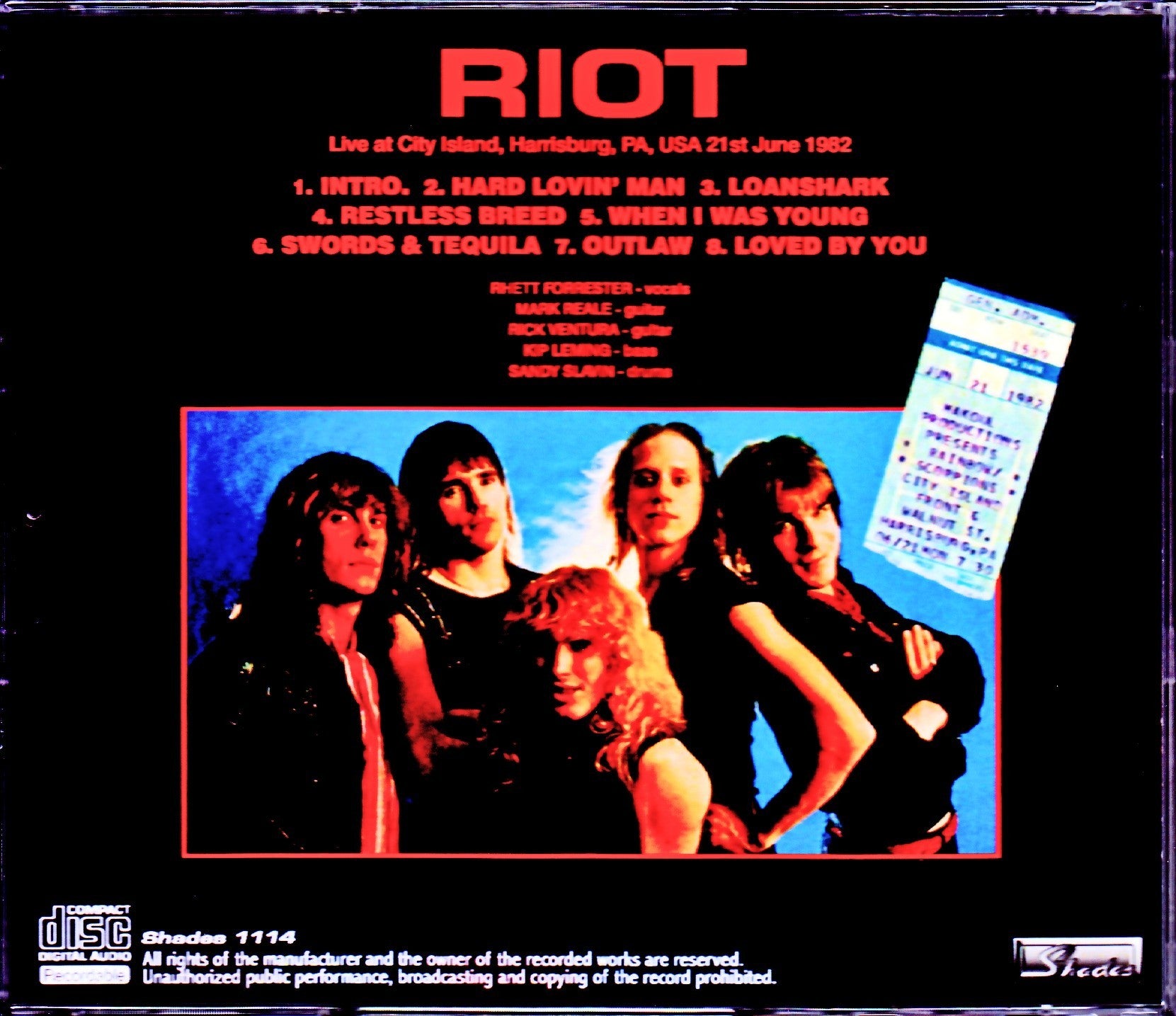 Newly discovered precious recordings from Rhett Forrister’s era. It will be released on the same day along with the RAINBOW and SCORPIONS editions of the same recording artist collection. This work includes “June 21, 1982 Harrisburg Performance”. This is the best audience recording. I’m sure many of you have already seen the RAINBOW version of “Black Box 029” and the SCORPIONS version of “Shades 1113,” but on this day, the headliner was Line Book, and the coupling show was supported by SCORPIONS and RIOT. Show. The three works with the same title released simultaneously this week are sister works recorded by the same recording artist. It’s best to experience all three works in one day, but this work alone is also a valuable RIOT masterpiece. Therefore, let’s check the show’s position on the tour schedule from RIOT’s perspective. [“RESTLESS BREED” released on March 21st]・June 2nd – July 5th: North America #1 (23 performances)←★Here★・August 12th – 19th: North America #2 (4 performances)・October 30th: Staten Island Performance This is the tour related to “RESTLESS BREED”. In fact, there was so little information about RIOT at the time that it’s hard to say with certainty that this is all there is to it. Although it is not very helpful, you can imagine that it was a very valuable time. In any case, the Harrisburg performance of this work is (probably) the 15th performance of “North America #1” exactly three months after the release of “RESTLESS BREED”. Speaking of the Rhett era, it is also included in the official EP “RIOT LIVE”, but it was a concert two weeks before that. This work, which records such a show, is comparable to the RAINBOW and SCORPIONS editions. In fact, as you can imagine from the fact that the RAINBOW edition has been made into a CD, it is a superb audience recording. This work is a master collection by a recording artist called “luvsufo”, which is currently a hot topic, and it is very refreshing. I wrote that in the RAINBOW and SCORPIONS editions, “it doesn’t have the close feeling of a sound board,” but in this work, the sound output is different due to the undercard, or is the position itself different?The core is stronger and the distance is also better. I feel close. Of course, the delicacy conveyed to the details is the same as the RAINBOW / SCORPIONS edition, and the beauty of Kinney recording is also firmly contained. With such a sound, RIOT is 100% authentic, including the late Rhett Forrister’s singing voice. Let’s organize the set while comparing it with the official EP “RIOT LIVE”. ●FIRE DOWN UNDER (2 songs)・Swords & Tequila・Songs that cannot be heard on EP [RIOT LIVE]: Outlaw ●RESTLESS BREED (5 songs)・Hard Lovin’ Man/Loanshark/Restless Breed/Loved by You・EP [RIOT LIVE] ] Song that can’t be heard: When I Was Young… and so on. Being the first of the three groups on the day, they had about 30 minutes to perform, and there were no songs like “Warrior” or “Narita,” and all songs were selected from “FIRE DOWN UNDER” and “RESTLESS BREED.” It is rare to hear the “FIRE DOWN UNDER” number with Rhett’s singing voice, and “RESTLESS BREED” is valuable just because it is performed live. “When I Was Young” and “Outlaw” were not heard on “RIOT LIVE”, and “When I Was Young” in particular is a hidden masterpiece cover of ANIMALS’ original song coated with RIOT’s unique heroic feel. The up-tempo that is unique to a live performance makes it even more metal, and it’s just so cool. What surprised me was the enthusiasm of the venue. Just to be sure, the performance sound of this work is powerful, and no matter how big the excitement on the scene is, it can be suppressed firmly. What I think is that there is a surprising amount of excitement (sorry!). The people gathered at the scene were RAINBOW fans and some SCORPIONS fans. Despite this, RIOT received as much reception as the headliners from the start of the show, and even “RESTLESS BREED”, which may not have been as popular, was met with joy. And Rhett’s singing voice, which more than meets those expectations, is also passionate and powerful enough to make you think of Kevin Dubrow. It’s so exciting that I can’t help but ask, “Hey, are you sure you’re not confusing me with QUIET RIOT?” However, at that time, QUIET RIOT had yet to make a comeback with “METAL HEALTH,” so that was impossible. Two years later, RIOT was forced to cease activities (masked disbandment), but if they had gotten solid management on their side and stuck with Rhett a little longer, RIOT’s breakthrough might not have been a dream… …This is a show that will drive you to such delusions. That and this is the truth about RIOT during the Rhett Forrister era. This is a superb audience recording that serves as a “sound witness” that narrates the scene. It is starting to be re-evaluated through official bootlegs, etc., but the truth is still in the customer records. It’s good to experience “early summer of 1982” in conjunction with the RAINBOW/SCORPIONS edition, and of course this work alone is a valuable masterpiece. And it’s totally OK if this work becomes the entrance to the Rhett era RIOT! A live album that can be enjoyed in any way. Live at City Island, Harrisburg, PA, USA 21st June 1982 PERFECT SOUND (31:02) 1. Intro 2. Hard Lovin’ Man 3. Loanshark 4. Restless Breed 5. When I Was Young 6. Swords & Tequila 7. Outlaw 8. Loved by You Rhett Forrester – vocals, harmonica Mark Reale – guitar Rick Ventura – guitar Kip Leming – bass Sandy Slavin – drums
