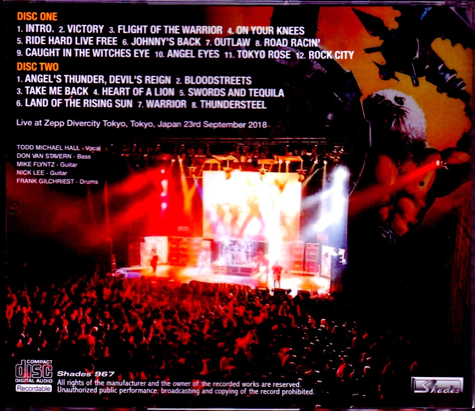 Our heavy metal warriors, RIOT, came to Japan for the 13th time (!!) in half a year (!). The latest and best live album is now available. Originally, they announced their participation in the annual autumn event “LOUD PARK 18” over a year ago, and announced a complete reenactment show to commemorate the 30th anniversary of “THUNDER STEEL”. However, in March, six months before that, he came to Japan alone. Just before the release of the new album “ARMOR OF LIGHT”, we completely recreated “THUNDER STEEL”. Although they did not withdraw their participation in “LOUD PARK 18,” it was announced that “LOUD PARK 18” itself would be cancelled. Of course, there had been rumors of cancellation for quite some time, so I thought, “That’s why I came here six months ago…” Naturally, I thought that my dream of coming to Japan in the fall would not come true…but RIOT made it happen. Although the original idea was to recreate THUNDERSTEEL with the participation of Tony Moore and Bobby Jarzombek, they came to Japan exactly as expected. This work includes the “September 23, 2018: Zepp Diver City Tokyo” performance. First of all, let’s check the schedule of arrival in Japan along with the previous one.・March 10: Club Citta Kawasaki “KAWASAKI 2018” ・March 11: Club Citta Kawasaki “KAWASAKI 2018” [“ARMOR OF LIGHT” released on April 25] – About half a year later – September 23: Zepp Diver City Tokyo [This work] All 3 performances. Last time there were two performances at Club Citta Kawasaki, which can be called the sacred place of RIOT, but this time we moved to a different location and only performed once. At our store, we have compiled the previous two performances into a super masterpiece 4-disc set “KAWASAKI 2018: THUNDERSTEEL 30TH SPECIAL IN JAPAN”, and this work is a live album that is also the final part of that. The “final chapter” is not just an afterthought. In fact, both the previous work “KAWASAKI 2018″ and this work are collections by the same recording artist. Yes, it is a superb recording by Mr. “Western Japan’s Strongest Taper”, a master familiar to metal fans. If you’ve caught your eye on this work, I’m sure you’ve experienced more than just one of Saikyo’s works, and his amazing skills are at full display, praised for being “like a soundboard” and “better than the actual sound.” Even in Japan, which is an advanced country for audience recording, he is said to be a great master when it comes to recording HR/HM. The on-set, thick core, the super clear details with zero sense of distance, the absence of surrounding noise, and yet the exquisite on-site feeling of the applause that seemed to come from far away… “KAWASAKI 2018” was also transcendental, but this work is not defeated either…or should I say, it is a super superb sound that is the highest peak even in the strongest collection full of super masterpieces. What is depicted with such a sound is the latest heavy metal live performance, similar to but different from the previous one. Last time it was a special set that focused on completely reproducing the famous album “THUNDERSTEEL”, but this time it’s a regular style. The theme is the new work “ARMOR OF LIGHT” released immediately after the last visit to Japan, and we will be able to listen to plenty of the best sets of all time. First of all, it’s a new song. The album kicks off with the killer “Victory” from the opening, and then continues with “Caught In The Witches Eye,” “Angel’s Thunder, Devil’s Reign,” and “Heart Of A Lion,” a total of four songs. Although “Armor Of Light” and “Messiah” that were performed last time were not performed, these four songs will be released for the first time in Japan this time. Combined with the previous work, half of “ARMOR OF LIGHT” can be experienced live. And everything else is just the best. Since this is their 13th visit to Japan, only new songs will be released for the first time, but the intensity increases each time they come. The balance is exquisite, with 6 songs from the Guy Speranza era (including “Outlaw,” “Tokyo Rose,” and “Rock City,” which you couldn’t hear last time), 5 songs from the Tony Moore era, and 5 songs from the restarted recent work. 7 songs including new songs. It’s sad that the Mike DiMeo era is symbolized by one song, “Angel Eyes,” but that doesn’t mean it’s a rush of special masterpieces that no other song can erase. And RIOT, who performs such a set, delivers a tremendous performance that is said to be the strongest of all time. Todd Michael Hall is truly outstanding. Although he looks exactly like Tony Moore, his vocalization is overwhelmingly better than Tony Moore himself. Previously, I was surprised that it was much more stable than Tony, but the power that can be heard at the peak is also transcendent. The amazing thing about the high-pitched singing of “On Your Knees”… Not only are they good at it, but they also have amazing dynamism that burns and melts the soul of metal. This time again, we can hear plenty of the throat that seems like it was born to sing with RIOT. This is a very fulfilling live album that brings the splendor of the masterpiece “ARMOR OF LIGHT” directly to the stage. This work alone is the ultimate metal paradise, but if you combine it with the previous work “KAWASAKI 2018”, you can complete “RIOT of 2018” with a trilogy by the same recording artist. You can have all the details of your favorite band’s visit to Japan at your fingertips…this bootleg-only experience is made possible with the finest sound. This is the perfect album as a best set live album or as the final part of three performances. Zepp Divercity Tokyo, Tokyo, Japan 23rd September 2018 ULTIMATE SOUND(from Original Masters) Disc 1 (53:48) 1. Intro. 2. Victory 3. Flight Of The Warrior 4. On Your Knees 5. Ride Hard Live Free 6. Johnny’s Back 7. O