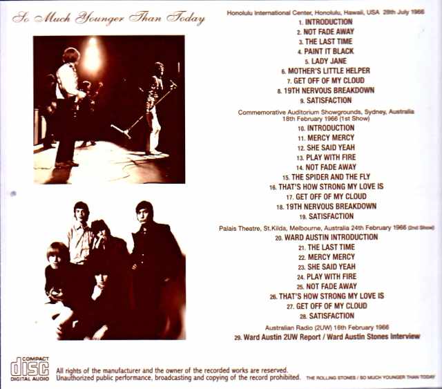 Even though it’s from the same year, 1966, the Honolulu ’66 recording is a well-known soundboard recording that allows you to enjoy a pure, unadulterated live performance from Brian Wilson’s time in the band, without any gimmicks like the official “GOT LIVE IF YOU WANT IT!”. Moreover, the youthful energy of the performance has been well-established since the LP era, and the original TSP release LP “SO MUCH YOUNGER THAN TODAY,” which this CD version is based on, was a huge hit despite being an aircheck recording. Later, with the advent of the CD era, the original broadcast recording was unearthed, dramatically improving the sound quality. It finally solidified its position as a standard live recording from the Brian Wilson era. However, it’s also true that when it first appeared, there were a series of releases with various problems, such as added reverb, hum noise due to being dubbed via VHS, and dropouts characteristic of vintage recordings. In fact, there were even items that were edited to conceal the dropouts. Because it’s such a classic recording, problems that had been overlooked were thoroughly re-examined by “GRAF ZEPPELIN,” resulting in the 2022 release “SO MUCH YOUNGER THAN TODAY,” which is literally the best version of the Honolulu concert. Like the many Stones live recordings that “GRAF ZEPPELIN” has supervised, the 2022 release has long since sold out. Moreover, it’s not just the best version of the Honolulu concert, but it also includes live recordings from Australia around the same time, making it a fulfilling 1966 live album, so why hasn’t it been reissued? There were even calls for a reissue like Phil Spell or Rubber Bowl to happen soon. As mentioned earlier, the Honolulu concert was already flawlessly produced, so the content of this release is the same as the 2022 version. While Brian’s guitar sound is often not very prominent in live recordings from this era, the fact that his guitar is loud throughout this Honolulu radio recording is a major attraction. This recording serves as a powerful reminder that he was the driving force behind this energetic performance. The added Sydney radio recording, recently unearthed as a rare 1966 recording, has garnered attention, but it was somewhat muffled and had a hum noise, giving it a distinctly digital sound. Therefore, “GRAF ZEPPELIN” undertook a thorough remastering to restore the analog feel characteristic of 1966. Here, the youthful performance shines brightly, and the inclusion of rare repertoire such as “She Said Yeah” and “That’s How Strong My Love,” which were not played in Honolulu, is a major draw. In the former, Mick’s voice sounds almost hoarse, a testament to his youth. The highlight is the band arrangement of “Play With Fire” with Brian on organ. The slightly chaotic performance in “Get Off Of My Cloud” is also youthful. Meanwhile, the Melbourne recording is a remastered version of a radio broadcast that was unearthed 20 years ago and became a hot topic. This recording boasts remarkably high sound quality, delivering a fantastic sound that rivals the Honolulu performance, vividly capturing the youthful yet raw energy of the band, and featuring a rare repertoire. The interview at the end even includes the interviewer’s uttered line, “Swingin’ pig!” Thus, this long-awaited re-release of a masterpiece, a full soundboard recording that more realistically captures the charm of the Stones’ 1966 live performance than the official “GOT LIVE IF YOU WANT IT!”. The jacket design also faithfully reproduces the feel of the original TSP release! Previous remaster notes: Mainly features the 1966 Honolulu performance. Also includes performances from Sydney and Melbourne in February of the same year. A 1966 live collection packed into one CD, exceeding 79 minutes. The CD title is an homage to the title of the original analog LP (TSP 012) featuring the Honolulu performance. Section 1: Honolulu, July 28, 1966 – Compared to previous releases, this is a better master with less hum noise. Frequent minor dropouts in the introduction and within songs have been corrected as much as possible. In particular, the dropouts that occurred in “The Last Time” and “Mother’s Little Helper” were not simply edited out, but restored seamlessly by adjusting the frequency band. Also, some parts of the introduction were cut in previous VGP releases to avoid dropouts. (On this release, around 0:17 on track 1, about 0.6 seconds are missing in the VGP version) Section 2: Sydney, February 18, 1966 (1st Show) The same master has been remastered again. Hum noise has been removed and the frequency range adjusted, making it much cleaner. Also, since the sound was quite digital with the hiss noise removed, EQ processing was done to return it to an analog texture. The buzzing sound that sometimes occurred intermittently around 3:15 in satisfaction has also been removed as seamlessly as possible (the processing marks are less noticeable than on the previous release) Section 3: Melbourne, February 24, 1966 (2nd Show) – Remastered from the old source. Some hum noise has been removed, making it cleaner, but there is no major difference. The slightly metallic sound is from the original. Tracks 01-09: Honolulu International Center, Honolulu, Hawaii, USA 28th July 1966 SBD Tracks 10-19: Commemorative Auditorium Showgrounds, Sydney, Australia 18th February 1966 (1st Show) SBD Tracks 20-28: Palais Theatre, St.Kilda, Melbourne, Australia 24th February 1966 (2nd Show) SBD Track 29: Australian radio (2UW) 16th February 1966 (79:16)Honolulu International Center, Honolulu, Hawaii, USA 28th July 1966 01. Introduction 02. Not Fade Away 03. The Last Time 04. Paint It Black 05. Lady Jane 06. Mother’s Little Helper 07. Get Off Of My Cloud 08. 19th Nervous Breakdown 09. Satisfaction Commemorative Auditorium Showgrounds, Sydney, Australia 18th February 1966 (1st Show) 10. Introduction 11. Mercy Me