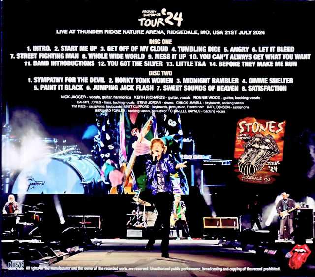 While the situation remains uncertain, the Rolling Stones’ live activities for 2026 have been cancelled. This means that the Stones’ most recent stage performance was in Ridgedale in 2024. Perhaps fearing that this might be the Stones’ last live performance, Daspyknows has now released his own recording of the Ridgedale show. Speaking of Ridgedale, a superb audience recording called “RIDGEDALE 2024” was released in real time, but it’s worthwhile that he has released this one again. It’s surprising to find that this is an even more superb audience recording than that one, and once again, the skills of a taper who releases later are on full display. The only thing that was cut was the MC after “Gimme Shelter,” but this has been neatly filled in from “RIDGEDALE 2024” for this release. Just listening to the sound effects before the Stones appear, the sound image is incredibly close. As expected of Daspyknows, releasing this a year and a half after the live show is not for nothing. This is not only an absolutely superb audience recording, but also of a quality that absolutely deserves to be released. I can guarantee that not only die-hard fans but also beginners can enjoy listening to this with ease. Moreover, the 2024 tour was significant because it was held in support of the new album “HACKNEY DIAMONDS,” which has already become a masterpiece, and the sense of the Stones being alive and active, which is rare in recent Stones tours, is truly wonderful. The power of the performance that resulted from this was immeasurable. That impression remains unchanged even now. And yet, the unprecedented pattern of increasing the Keith corner to three songs midway through the tour, and the change of temporarily not playing “Sweet Sounds of Heaven,” are now fond memories. The fact that there were Stones-like changes throughout the tour may have further enhanced its evaluation. It wouldn’t be an exaggeration to say that 2024 was perhaps the best tour in recent years, and the performance on the final day was truly magnificent. “RIDGEDALE 2024,” which captured that performance in the highest sound quality, is also truly wonderful. The audience recording, with its even better sound quality, conveys the brilliance of the performance that day even more effectively. In fact, the sound image is so close that it feels almost too real. The best moment of this final day of the best tour was undoubtedly when the new songs from ‘HACKNEY DIAMONDS’ were played one after another. While “Let It Bleed” and “Street Fighting Man,” played before that, were the highlights of the day, it was the new songs that truly shone. First of all, the energetic performance of “Whole Wide World” was overwhelming. It felt like we were witnessing the pinnacle of the Stones’ performance on the final day of the tour. The subsequent performance of “Mess It Up” was also breathtaking, with its solid performance. These two songs alone make it a truly wonderful day, and the overwhelming quality of this Daspyknows recording also stands out. This outstanding recording quality also highlights the quietness of Keith’s corner (laughs), making it the most enjoyable listening experience. The sound of “Sympathy For The Devil” and “Honky Tonk Women,” which follow his segment, is incredibly close right from the intro, truly soundboard quality. And the incident during “Paint It Black,” which caused a stir at the time, where Keith had to change his guitar and they ended up jamming to fill the gap, sounds even more realistic. Thunder Ridge Nature Arena, Ridgedale, MO, USA 21 July 2024 TRULY PERFECT SOUND Disc:1 (64:05) 1. Intro 2. Start Me Up 3. Get Off Of My Cloud 4. Tumbling Dice ★The change in sound quality at 3:31 is original (the same phenomenon occurred in previous releases) 5. Angry 6. Let It Bleed 7. Street Fighting Man 8. Whole Wide World 9. Mess It Up 10. You Can’t Always Get What You Want 11. Band introductions 12. You Got The Silver 13. Little T&A 14. Before They Make Me Run Disc:2 (58:33) 1. Sympathy For The Devil 2. Honky Tonk Women 3. Midnight Rambler 4. Gimme Shelter ★6:50 – 6:53 Supplemented with previously released material 5. Paint It Black 6. Jumping Jack Flash 7. Sweet Sounds Of Heaven 8. Satisfaction