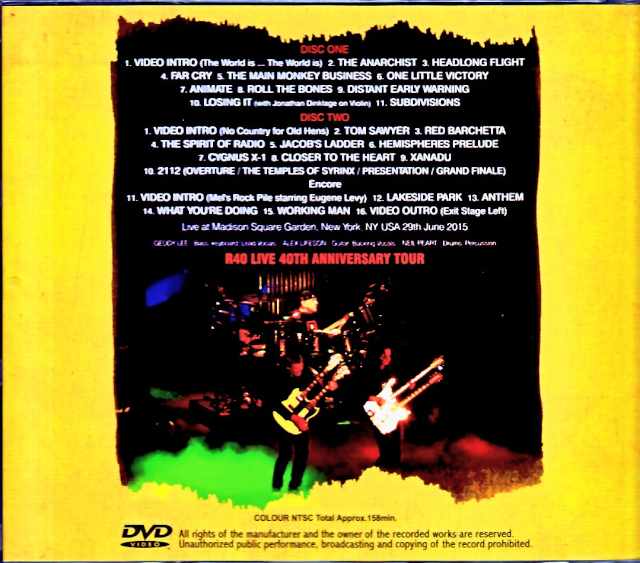 This 2-hour, 38-minute high-quality audience shot captures the highlight of the June 29th performance at Madison Square Garden in New York City from the 2015 North American leg of Neil Peart’s 40th anniversary “R40 LIVE TOUR,” which ultimately became his final tour. While the official footage from this tour was the home Toronto performance, this MSG performance was much later, the penultimate show. Also featured are tracks not seen on the official “R40 LIVE” release, such as “One Little Victory,” “Distant Early Warning,” and “Red Barchetta.” Special guest appearance by Jonathan Dinklage on “Losing It” from “SIGNALS,” where he intertwines with the trio on flowing violin, adds to the highlights. R40 Live 40th Anniversary Tour / at Madison Square Garden, NYC, NY. USA 29th June 2015 : COLOUR NTSC Approx. 158min. Disc 1 : 1. Video Intro (The World is … The World is) 2. The Anarchist 3. Headlong Fligh 4. Far Cry 5. The Main Monkey Business 6. One Little Victory 7. Animate 8. Roll The Bones 9. Distant Early Warning 10. Losing It 11. Subdivisions Disc 2 : 1. Video Intro (No Country for Old Hens) 2. Tom Sawyer 3. Red Barchetta 4. The Spirit of Radio 5. Jacob’s Ladder 6. Hemispheres Prelude 7. Cygnus X-1 8. Closer To The Heart 9. Xanadu 10. 2112(Overture/The Temples of Syrinx/Presentation/Grand Finale) -encore- 11. Video Intro (Mel’s Rock Pile starring Eugene Levy) 12. Lakeside Park 13. Anthem 14. What You’re Doing 15. Working Man 16. Video: Exit Stage Left