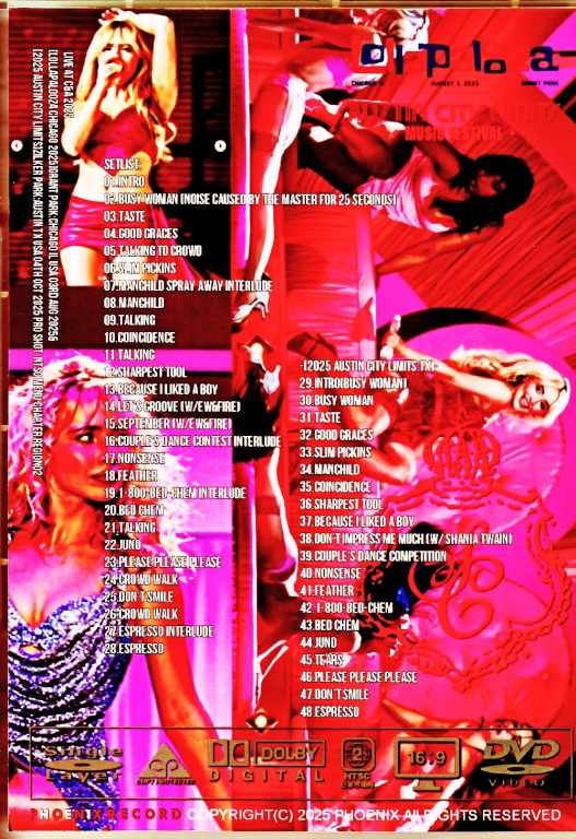 This DVD features footage from LIVE AT C&A 2025, featuring performances from Chicago in August [lollapalooza Chicago 2025] and Austin in October [2025 Austin City Limits], coupled using Pro sources. The 2025 tour kicked off in March in Europe and continued in North America in October. This DVD captures the live performance at Chicago’s popular festival [lollapalooza Chicago 2025] and her performance at Austin in October [2025 Austin City Limits], truly showcasing Sabrina Carpenter’s charm. Her popularity has only grown in 2025, and her performances on stage are filled with confidence and ease. EW&F’s guest appearance at [lollapalooza Chicago 2025] added a touch of glamour to the show, making for a truly enjoyable performance. The video quality is Pro, ensuring consistent enjoyment over the approximately 2.5 hours. There is about 25 seconds of noise caused by the master on track 02, but there are no other issues. LIVE AT C&A 2025 [lollapalooza Chicago 2025] Grant Park: Chicago IL USA 03rd Aug 2025 & [2025 Austin City Limits] Zilker Park: Austin TX USA 04th Oct 2025 NTSC Menu Chapter region02 01.Intro 02.Busy Woman (Noise caused by the master for 25 seconds) 03.Taste 04.Good Graces 05.Talking To Crowd 06.Slim Pickins 07.Manchild Spray Away Interlude 08.Manchild 09.Talking 10.Coincidence 11.Talking 12.Sharpest Tool 13.Because I liked a boy 14.Let’s Groove (w/EW&Fire) 15.September (w/EW&Fire) 16.Couple’s Dance Contest Interlude 17.Nonsense 18.Feather 19.1-800-BED-CHEM Interlude 20.Bed Chem 21.Talking 22.Juno 23.Please Please Please 24.Crowd Walk 25.Don’t Smile 26.Crowd Walk 27.Espresso Interlude 28.Espresso -[2025 Austin City Limits:TX]- 29.Intro (busy woman) 30.Busy Woman 31.Taste 32.Good Graces 33.slim pickins 34.manchild 35.coincidence 36.sharpest tool 37.because I liked a boy 38.don’t impress me much (w/ Shania Twain) 39.Couple’s Dance Competition 40.nonsense 41.feather 42.1-800-BED-CHEM 43.bed chem 44.Juno 45.tears 46.please please please 47.don’t smile 48.espresso