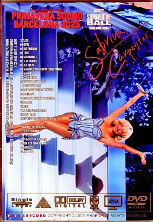 This DVD features a professional-quality recording of Sabrina Carpenter’s performance at the Primavera Sound 2025 rock festival, held at the Revolut Stage Parc del Fòrum Barcelona on June 6, 2025. With the success of her sixth studio album, “Short n’ Sweet,” she made a global breakthrough in 2025, even headlining festivals around the world. This DVD features a unique and captivating performance, showcasing her sometimes cute and sometimes quirky side. The powerful and realistic live performance will leave you lost in time as you savored the incredible concert. The bonus track includes a professional recording of the performance at Capital’s Summertime Ball 2024, the annual Capital-sponsored event held at Wembley Stadium in London in 2024. The video quality is consistent and high-quality, ensuring a truly enjoyable experience. Short n’ Sweet Tour 2025 [Primavera Sound 2025]Revolut stage Parc del Fòrum Barcelona 6th June 2025+[Capital’s Summertime Ball 2024] Wembley Stadium:London England 16th June 2024 Proshot NTSC Menu Chapter region02 01.Intro 02.Busy Woman 03.Taste 04.Good Graces 05.Slim Pickins 06.Bed Chem 07.Manchild Spray Away (Video intro) 08.Manchild 09.Coincidence 10.because i liked a boy 11.It’s Raining Men 12.Couple’s Dance Competition 13.Nonsense 14.Couldn’t Make It Any Harder 15.Feather 16.Juno 17.Please Please Please 18.Don’t Smile 19.Espresso (extended intro & outro) -(London England 2024)- 20.Read your Mind 21.Feather 22.Please Please Please 23.because i liked a boy 24.Espresso 25.Nonsense