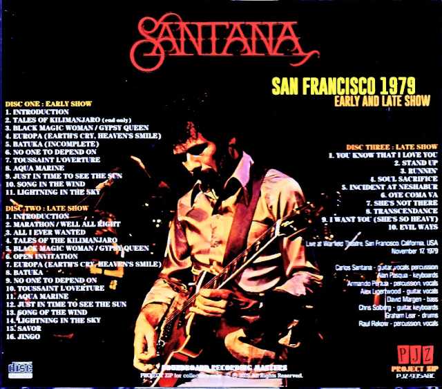 Santana’s 1979 US tour features two performances, an early show and a late show at the San Francisco Warfield Theater on November 17th, recorded on a three-disc set with high-quality soundboard recordings! While the early show only includes the first half, the late show is almost complete, from the opening to the encore. Both are high-quality soundboard recordings direct from the mixer. This is a must-see title as a newly discovered live recording from this period, when the band lineup was completely renewed and the album “Marathon” was released! Live at Warfield Theatre, San Francisco, California, USA November 17, 1979 DISC ONE : EARLY SHOW 01. Introduction 02. Tales of Kilimanjaro (end only) 03. Black Magic Woman / Gypsy Queen 04. Europa (Earth’s Cry, Heaven’s Smile) 05. Batuka (incomplete) 06. No One To Depend On 07. Toussaint L’Overture 08. Aqua Marine 09. Just In Time To See The Sun 10. Song In The Wind 11. Lightning In The Sky DISC TWO : LATE SHOW 01. Introduction 02. Marathon / Well All Right 03. All I Ever Wanted 04. Tales of the Kilimanjaro 05. Black Magic Woman / Gypsy Queen 06. Open Invitation 07. Europa (Earth’s Cry, Heaven’s Smile) 08. Batuka 09. No One To Depend On 10. Toussaint L’Overture 11. Aqua Marine 12. Just In Time To See The Sun 13. Song Of The Wind 14. Lightning In The Sky 15. Savor 16. Jingo DISC THREE : LATE SHOW 01. You Know That I Love You 02. Stand Up 03. Runnin’ 04. Soul Sacrifice 05. Incident at Neshabur 06. Oye Coma Va 07. She’s Not There 08. Transcendance 09. I Want You (She’s So Heavy) 10. Evil Ways Carlos Santana – guitar, vocals, percussion Alan Pasqua – keyboards Armando Peraza – percussion, vocals Alex Ligertwood – guitar, vocals David Margen – bass Chris Solberg – guitar, keyboards Graham Lear – drums Raul Rekow – percussion, vocals