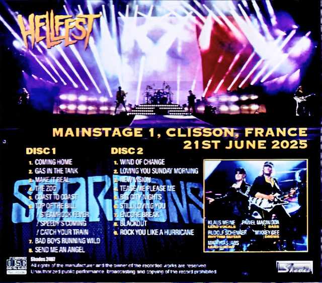 SCORPIONS successfully completed the main leg of their 60th anniversary tour. Here’s a superb recording of the scene. This work features the “June 21, 2025 Clisson performance.” It’s a thick audience recording from their appearance at France’s leading metal festival, “HELLFEST.” This “60th Anniversary Tour” has attracted a lot of attention, with a string of masterpieces recorded by the audience. It’s also very popular in our shop. With the collection organized, let’s take a bird’s-eye view of the tour again.・March 15th: Vive Latino performance ・April 16th-24th: South America (4 shows) ・May 6th + 8th: Mexico (2 shows) *June 4th – July 26th: Europe #1 (18 shows) ←★Click here★ ・August 14th-23rd: Las Vegas (5 shows) ・September 6th-14th: Europe #2 (4 shows) ・October 15th + 21st: Middle East (2 shows) This is the schedule that has been announced to date. In fact, the number of shows for “Europe #2” has increased since the last report, and “Middle East” has been added. This is a rare development, with new shows being added even as the actual event draws near. Among them, the one that just ended was “Europe #1,” which featured a string of masterpieces. Let’s focus more on the dates and check their relative positions. Details for “Europe” ・June 4th: Appearance at Skive Festival *June 6th “SWEDEN ROCK FESTIVAL 2025” ・June 9th + 11th (2 shows) *June 16th “POLAND 2025 (Gdansk)” *June 18th “POLAND 2025 (Krakow)” *June 21st: Appearance at Hellfest ←★This album★ *June 24th “PARIS 2025” ・June 27th + 29th (2 shows) *July 5th: Performance in Hanover ←※Official (planned) ・July 10th – 26th (7 shows) … and so on. The performance in their hometown of Hanover, which was held on the same day as Ozzy’s “BACK TO THE BEGINNING”, is scheduled to be released as the official album “COMING HOME TO HANNOVER”, and this album comes four shows before that. This was also the show before the release of their acclaimed IEM album, “PARIS 2025: ORIGINAL IEM RECORDING.” This vacuum-packed recording captures the venue, delivering 100% pure, premium audience sound. Though it’s a recording of the audience without any IEMs or other additives, it’s incredibly clear, with sharp definition and separation. Perhaps because it was an outdoor festival with zero echo, the direct, thick sound is as satisfying as an FM broadcast. Moreover, the stability is excellent. This is just a guess, but I suspect the microphones were probably recording toward the PA tower away from the stage. While the thick core is on and close, there’s no confusion like there would be in the front seats. In fact, during tracks like “The Zoo” and “Coast to Coast,” even the voices of nearby conversations are absorbed, but their strangely relaxed nature creates a different mood than a packed front row. Despite being close to a soundboard, you can concentrate on the performance without getting caught up in the commotion… In reality, you’ll want to move forward, but the recordist’s patience is what allows you to enjoy the thick feel of this work. This extra-thick direct sound is depicted in the special set of the 60th anniversary tour. While already familiar, this day was a bit shortened for festivals, so let’s reorganize it. The album includes: Forbidden Tattoo (5 songs), Coming Home, Bad Boys Running Wild, Big City Nights, Still Loving You, Rock You Like A Hurricane; Crazy World (3 songs), Send Me An Angel, Wind Of Change, Tease Me Please Me; and others (7 songs + α): Gas In The Tank, Make It Real, The Zoo, Coast To Coast, Loving You Sunday Morning, Blackout; and a 70s medley: Top Of The Bill, Steamrock Fever, Speedy’s Coming, and Catch Your Train. Compared to other performances, Matthias’ guitar solos, “Delicate Dance” and “I’m Leaving You,” are omitted. However, the interesting thing about music is that just because it’s short doesn’t mean it’s bad. I’m not sure if it’s because of the set, but the ensemble is stable and very well-made. In particular, 77-year-old Klaus Meine (one year older than Ozzy), has been experiencing increasingly volatile performances depending on the day, but this day was a hit. As mentioned above, this is the fifth performance in our collection, and it’s a surefire contender. Boasting a direct feel comparable to an IEM album, this is a masterpiece of a pure live album with no counts or clicks. This is an exceptional new masterpiece, even among the popular 60th Anniversary Tour Collection. This is an extremely thick audience recording of the “HELLFEST performance on June 21, 2025.” It’s incredibly clear, with a clear outline and distinct separation. Perhaps because it was an outdoor festival with zero reverberation, the super-thick sound picked up directly from the output is as satisfying as an FM broadcast. Although “I’m Leaving You” is omitted from the festival set, perhaps because of this, Klaus Meine can also experience the successful 60th anniversary tour on site. Mainstage 1, Clisson, France 21st June 2025 TRULY PERFECT SOUND Disc 1(39:58) 1. Coming Home 2. Gas in the Tank 3. Make It Real 4. The Zoo 5. Coast to Coast 6. Top of the Bill / Steamrock Fever / Speedy’s Coming / Catch Your Train 7. Bad Boys Running Wild 8. Send Me an Angel Disc 2(46:10) 1. Wind of Change 2. Loving You Sunday Morning 3. New Vision 4. Tease Me Please Me 5. Big City Nights 6. Still Loving You 7. Encore 8. Blackout 9. Rock You Like a Hurricane Klaus Meine – lead vocals Rudolf Schenker – rhythm guitar, backing vocals Matthias Jabs – lead guitar, backing vocals Pawe M Ciwoda – bass, backing vocals Mikkey Dee – drums