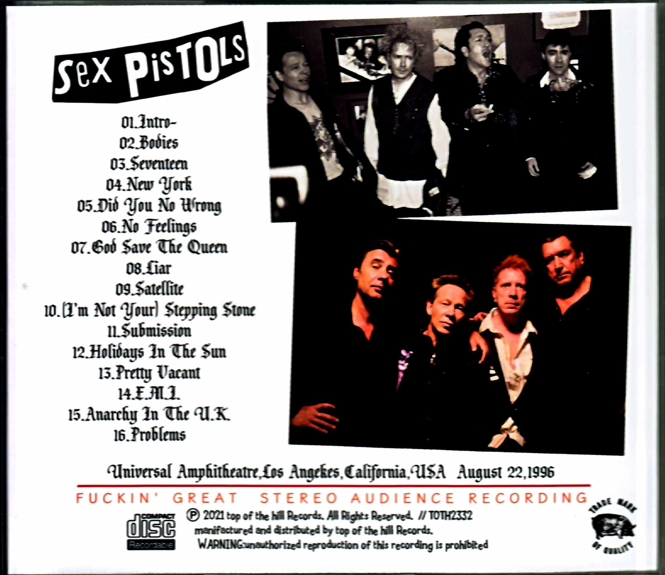 A treasured sound source that completely records the California performance from the 1996 Reunion North American tour with a good stereo audience recording is now available! On August 22, 1996, the reunion was held in California, L.A. A. Introducing a treasured sound source that completely records the live performance held at Universal Amphitheater, a semi-circular theater, with excellent stereo audience recording! Digitally transferred directly from the cassette master. It was recorded near the center of the front of the stage, and in the master, the parts slightly further away are also recorded with loud and clear sound quality by remastering. Although you can hear the audience’s shouts and chatting noises, you can experience the power of being in the middle of a packed semi-amphitheater that can accommodate approximately 6,200 people. It is recorded from the scene where the members appear on stage, and since the tape was changed after “Holidays In The Sun” ended, all songs are completely uncut, including the encore. With the same set list as the official live album “FILTHY LUCRE LIVE” which recorded the London performance in June of the same year, the audience’s lively voices asking each other “Are you okay?” after the end of “Submission”, and the next “Holidays In The Sun” You can enjoy the best performance that showers the audience with intense backbeats as the audience heats up even more! Universal Amphitheater,Los Angeles,California,USA August 22,1996 01.Intro- 02.Bodies 03.Seventeen 04.New York 05.Did You No Wrong 06.No Feelings 07.God Save The Queen 08.Liar 09.Satellite 10 .(I’m Not Your) Stepping Stone 11.Submission 12.Holidays In The Sun 13.Pretty Vacant 14.E.M.I. 15.Anarchy In The U.K. 16.Problems