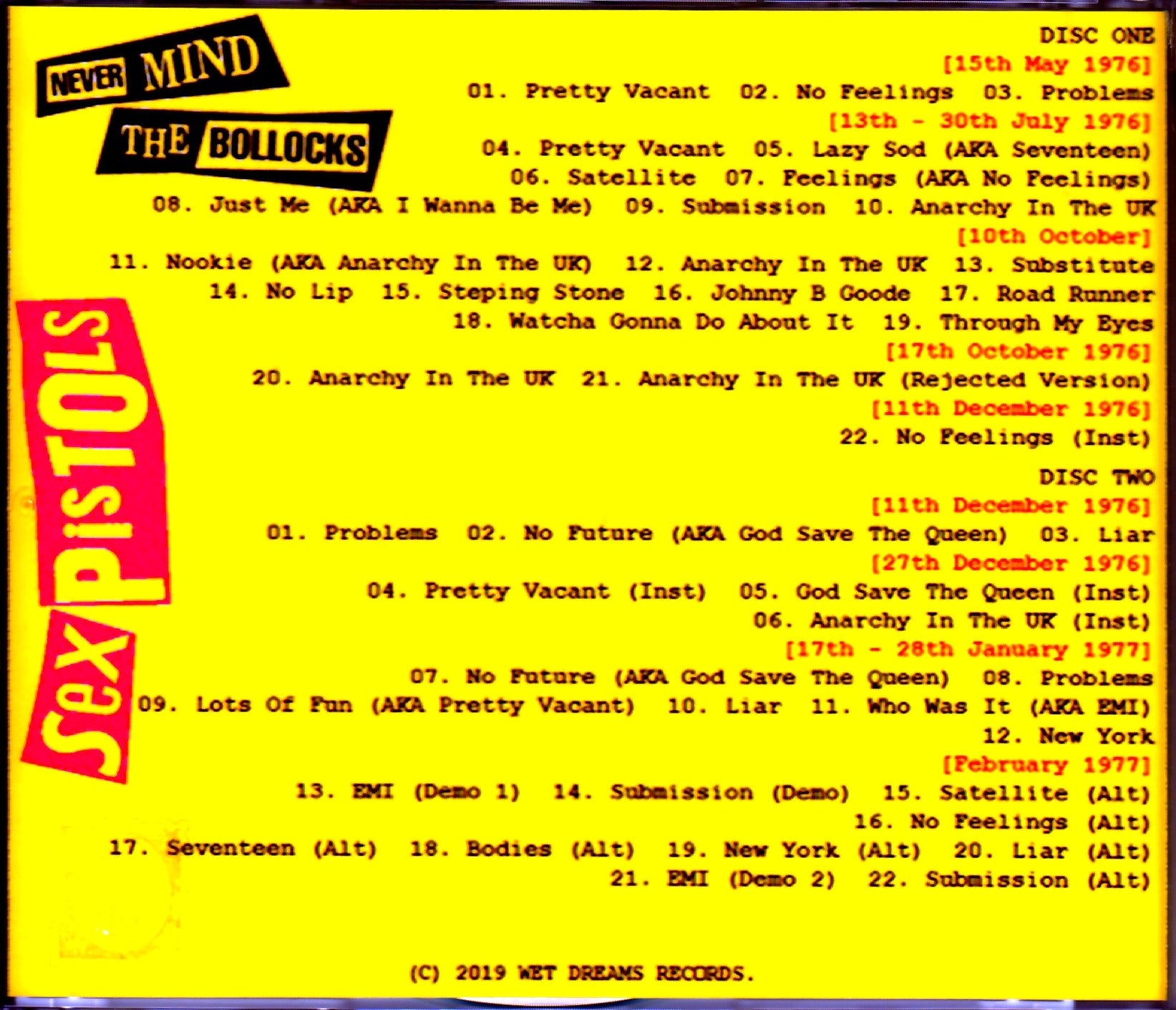 Introducing a rare title that almost completely records the recording sessions of the legendary punk band “Sex Pistols” from 1976 to 1977 on a high-quality soundboard (2-disc set)! This title refers to the legendary punk band that has made its name known all over the world despite being active for only three years (reunited in 1996) and continues to have an immeasurable influence on the world’s music scene since then. A valuable title that almost completely records the session sound source of “Sex Pistols”. A must-listen to the live sound that is different from the familiar original sound source produced by “Chris Thomas”! Permanent preservation disc, recommended collector’s item! ! DISC ONE [15th May 1976] : 01. Pretty Vacant 02. No Feelings 03. Problems [13th – 30th July 1976] : 04. Pretty Vacant 05. Lazy Sod (AKA Seventeen) 06. Satellite 07. Feelings (AKA No Feelings) 08. Just Me (AKA I Wanna Be Me) 09. Submission 10. Anarchy In The UK [10th October] : 11. Nookie (AKA Anarchy In The UK) 12. Anarchy In The UK 13. Substitute 14. No Lip 15. Stepping Stone 16. Johnny B Goode 17. Road Runner 18. Watcha Gonna Do About It 19. Through My Eyes [17th October 1976] : 20. Anarchy In The UK 21. Anarchy In The UK (Rejected Version) [11th December 1976] : 22. No Feelings (Inst) DISC TWO [11th December 1976] : 01. Problems 02. No Future (AKA God Save The Queen) 03. Liar [27th December 1976] : 04. Pretty Vacant (Inst) 05. God Save The Queen (Inst) 06. Anarchy In The UK (Inst) [17th – 28th January 1977 : 07. No Future (AKA God Save The Queen) 08. Problems 09. Lots Of Fun (AKA Pretty Vacant) 10. Liar 11. Who Was It (AKA EMI) 12. New York [February 1977] : 13. EMI (Demo 1) 14. Submission (Demo) 15. Satellite (Alt) 16. No Feelings (Alt) 17. Seventeen (Alt) 18. Bodies (Alt) 19. New York (Alt) 20. Liar (Alt) 21. EMI (Demo 2) 22. Submission (Alt) The Complete Sessions Outtakes & Demos 1976-1977. SOURCE: EXCELLENT SOUNDBOARD RECORDINGS.