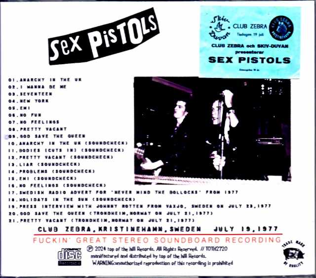 In July 1977, a live show in Sweden was recorded by high -quality stereo soundboard recording, and analog boots containing rehearsals and the like were brushed up! In February 2024, the two -disc analog boot “Looking for A Kiss in Kristinehamn”, which was available only 300 sheets, is currently trading overseas at a premium price, making it difficult to obtain, but this work is the contents of its recording. All of the digital transfers appeared as a brush -up edition that has been corrected and remastered! This analog dropped sound source on the net is an interview with two Norwegian songs, and all the pitches, including the Sweden radio ads, are all digitized, and the pitch is carefully corrected and digitized. You can only listen to the thing in this work! Live and rehearsals performed at Sweden, Christinaham and Club Zebra on July 19, 1977 with high -quality stereo soundboard recording. The first appearance sound source that I couldn’t hear before! Although it is a rough mix directly in the mixing board, it has a very clear sound quality, and there are some places where the volume of the guitar becomes unstable, but the rough mix, including that, has amplified freshness. In the master, the ending of “God Save the Queen” is lacking, but here it is edited to compensate for the same song in the Norwegian performance. The last two songs were recorded on July 21 of the same year in the live recording of Norway and Tronheim, and “God Save the Queen” was included in the regular board “Kiss this”, but the collision sound of the car. It is covered, and you can listen to the version without the sound effect here. And “Pretty Vacant” is a rare sound source that will appear for the first time! A killer item that can be heard in the best state of brushed up the surprising first appearance sound source that is inevitable in agony! Club Zebra, Kristinehamn, Sweden JULY 19,1977 01.anarchy In UK 02.I Wanna Be Me 03.new YORK 05.NO FELINGS 08.Pr etty vacant 09.god save the queen 10. ) 15.Emi (Soundcheck) 16.No Feelings (Soundcheck ) Swedish Radio Advert For ‘Bollocks’ from 1977 18.Holidays In The Sun äxjö, Sweden on JULY 23,1977 20.god save the queen (Trondheim, NORWAY ON JULY 21,1977) 21.Pretty vacant (TronDheim, NORWAY ON JULY 21,1977)