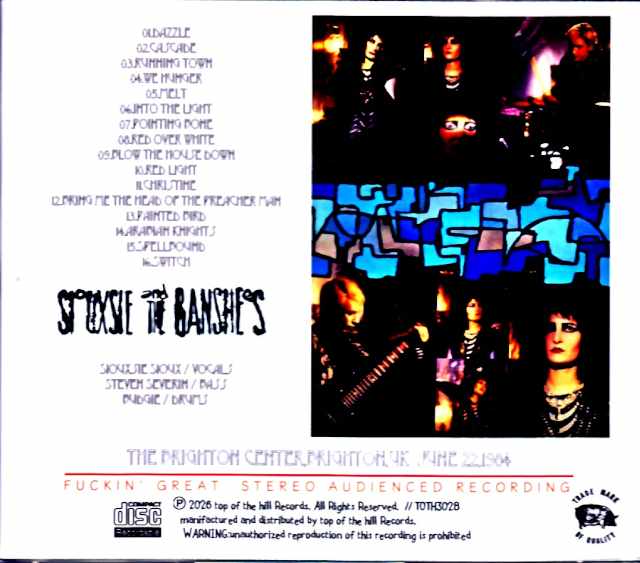 A rare recording has emerged, capturing a complete high-quality stereo audience recording of a Brighton concert in June 1984, shortly after the addition of new guitarist John Valentine Carruzas! This rare recording captures a live performance held on June 22, 1984, at The Brighton Centre, a conference center in Brighton, shortly after John Valentine Carruzas joined the band as new guitarist, following Robert Smith’s departure and the release of the EP “THE THORN” in October 1984. The recording boasts a wide dynamic range, with well-balanced and stable sound quality for both vocals and other parts. Furthermore, the pitch, which was off by nearly a whole tone due to the master recording, has been carefully corrected. The setlist features five tracks from the album “Hyaena,” released shortly after the album’s launch, including the opening track “Dazzle,” and also includes “Red Over White” from the EP “THE THORN,” released in October of the same year. The Cardiff concert from the previous day is available on a previously released album by the same label, also featuring a high-quality stereo audience recording, but “Blow The House Down” and the final track, “Switch,” were not played at that concert. You can enjoy a powerful performance in high fidelity, showcasing the kaleidoscopic guitar playing of new guitarist John, who seems to have joined the band so soon after, seamlessly blending into the mix! The Brighton Center,Brighton,UK June 22,1984 01.Dazzle 02.Cascade 03.Running Town 04.We Hunger 05.Melt 06.Into The Light 07.Pointing Bone 08.Red Over White 09.Blow The House Down 10.Red Light 11.Christine 12.Bring Me The Head Of The Preacher Man 13.Painted Bird 14.Arabian Knights 15.Spellbound 16.Switch Siouxsie Sioux / vocals Steven Severin / bass Budgie / drumsJon Valentine Carruthers / guitars