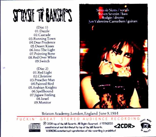 A rare recording has emerged, capturing the second night of a London tour in June 1984, shortly after the addition of new guitarist John Valentine Carruzas! This rare recording captures the entire live performance at the Brixton Academy, a venue in South London with a capacity of approximately 2300 people, on June 9, 1984, shortly after the addition of new guitarist John Valentine Carruzas, who joined the band for the EP “THE THORN,” released in October 1984, following Robert Smith’s departure. The audio was digitally transferred from a low-generation master, resulting in a wide dynamic range and a well-balanced, stable sound for the time, with vocals and all other parts being of superior quality. Furthermore, any positional discrepancies caused by the master have been carefully corrected. This was the second of two consecutive performances at Brixton Academy. While the first night’s recording was available on the label’s previously released album, “BRIXTON ACADEMY 84 (TOTH2865),” in high-quality stereo audience recording format, this is the first time the second night’s recording has been released. The show opens with “Dazzle,” featuring a long version of the string intro. The setlist features four songs from the album “Hyaena,” released that day, as well as a Beatles cover, “Dear Prudence,” a single released the previous year. “Red Over White” from the EP “THE THORN,” released in October of the same year, is also played. You can enjoy a powerful performance in high quality, where new guitarist John’s kaleidoscopic guitar playing, which is surprisingly sophisticated for someone who had just joined the band, blends seamlessly into the mix! Brixton Academy,London UK June 9,1984 (Disc 1) 01.Dazzle 02.Cascade 03.Running Town 04.Dear Prudence 05.Desert Kisses 06.Into The Light 07.Pointing Bone 08.Red Over White 09.Switch (Disc 2) 01.Red Light 02.Christine 03.Preacher Man 04.Painted Bird 05.Arabian Knights 06.Spellbound 07.Jigsaw Feeling 08.Israel 09.Monitor Siouxsie Sioux / vocals Steven Severin / bass Budgie / drums Jon Valentine Carruthers / guitars