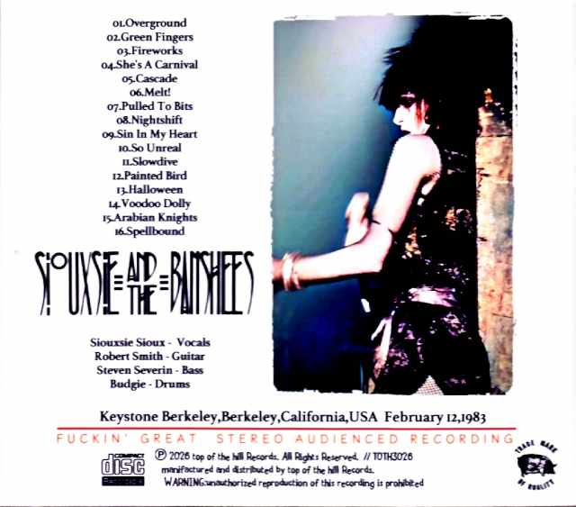 A rare recording has emerged from a December 1982 concert in the Netherlands, captured in high-quality stereo audience recording! The Bangees, with Robert Smith (who would later form The Cure) as their guitarist, replacing John McGough who left the band after their Madrid gig in October 1982 due to his alcohol problems, performed at the De Oosterport Theatre in Groningen, Netherlands on December 19th of the same year. This rare recording captures the band’s live performance in high-quality stereo audience recording! The sound image has depth, with extended highs and lows, and each part, including the vocals, is well-balanced, resulting in a clear, high-quality sound that can be confidently described as top-class for its time. Furthermore, pitch deviations due to the master have been carefully corrected. The recording features six songs, including “Slowdive” and “Melt!”, which were singles cut from their album “Kiss in the Dreamhouse” released shortly after, and also includes “Fireworks,” a single released in May of the same year. This is a rare live recording from the time when Robert Smith was a member of the band, as his only studio appearance was on the 1984 album “Hyena,” making it a very short-lived collaboration! Steve Severin and Robert Smith were also active in The Grove at the same time, and this killer item features their perfectly coordinated performance, including the encore, in its entirety without any cuts! De Oosterpoort,Groningen,Netherlands December 19,1982 01.Overground 02.Green Fingers 03.Fireworks 04.She’s A Carnival 05.Cascade 06.Melt! 07.Pulled To Bits 08.Nightshift 09.Sin In My Heart 10.So Unreal 11.Slowdive 12.Painted Bird 13.Halloween 14.Voodoo Dolly 15.Arabian Knights 16.Spellbound Siouxsie Sioux – Vocals Robert Smith – Guitar Steven Severin – Bass Budgie – Drums