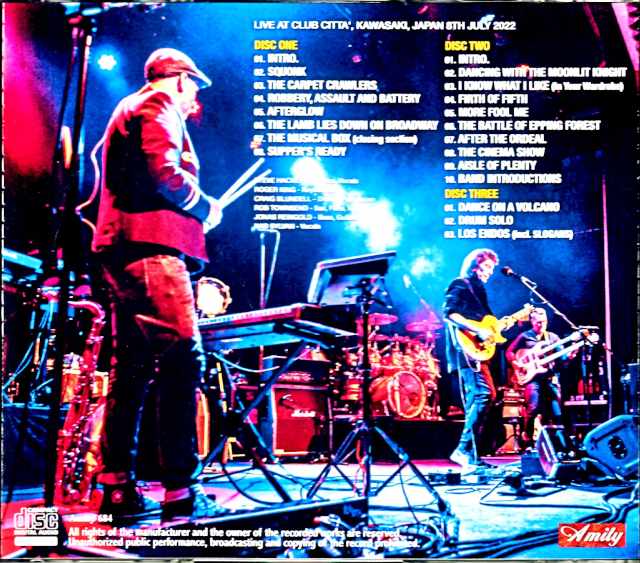 Steve Hackett overcame the COVID-19 pandemic to perform in Japan for the first time in four years. An original recording of the latest live performance based on the theme of GENESIS’ masterpieces “Moonlight Knight” and “Dazzling Super Live” has been decided to be released urgently. This work is recorded at the “Club Citta Kawasaki” performance on July 8, 2022. This is a very thick audience recording. This visit to Japan is only three performances in Kawasaki, and this work is a live album that vacuum-packs the whole story of the first day. It is a great feeling to be able to introduce the latest visit to Japan in this way, but the sound of this work enhances that feeling even more. It is an original recording given to me by the recorder himself, and it is also wonderful. While it is filled with the beauty of an audience that has absorbed the hall sound, the density and the fineness of the details are far from the customer record. The secret to not hiding the details even if the sound is thick is that the core is incredibly thick and has a rushing force. The core, which boasts a rich response even to the deep bass, breaks through the air and reaches straight to the ears. Particularly wonderful are the vivid mid-high tones. While the deep bass such as the bass drum and bass are somewhat powerful, the mid-high tones of the vocals, snare, keyboard, etc. are full of a soundboard-like zero distance feeling, and even the subtleties of the subtleties are clear. This contrast also gives Hackett’s first-class symphonic rock a powerful dynamism. Such a dynamic sound depicts the latest full show, which is a hot topic for reproducing GENESIS masterpieces. Before coming to Japan, Hackett had a re-enactment tour of “Dazzling Super Live”, but this time in Japan, the re-enactment of “Moonlight Knight” was also advertised. Of course, “Dazzling Super Live” also includes the “Moonlight Knight” number, so it is impossible to completely reproduce the two works at the same time… It was a bit of a mystery how the show would be composed. Here, let’s analyze the set that will answer that question. Part 1 (DISC 1) Dazzling Super Live (side A): Squonk / The Carpet Crawlers / Robbery, Assault Battery / Afterglow Dazzling Super Live (sides B/C): The Lamb Lies Down On Broadway / The Musical Box / Supper’s Ready Part 2 (DISC 2) Moonlight Knight (all songs) Encore (DISC 3) Dazzling Super Live (side D): Dance on a Volcano / Los Endos (incl. Slogans) … and so on. Hackett’s solo songs are almost GENESIS heaven, with only a brief glimpse of “Los Endos” played at the very end. The show is “two parts + encore”, and this work is a three-disc set with one disc for each part. The second part is a complete reproduction of “Moonlight Knight”, and even the song order is played exactly the same. And the “Dazzling Super Live” numbers are distributed before and after it. While the “Moonlight Knight” number has been omitted, the order of the songs is the same as the album. As a result, the A side of “Dazzling Super Live” is a perfect reproduction, while the B, C, and D sides are reproduced with missing teeth. It may seem half-baked when written like this, but when you actually listen to it, the flow is perfect. The show starts in the same way as the dramatic opening of “Dazzling Super Live”, and while you are immersed in the world of the famous live album, you are surprised by the fact that the “Moonlight Knight” number has been removed in the B side part. And then, at last, the perfect reproduction of “Moonlight Knight”! If the whole live is reproduced as an album, it becomes too predictable and boring, but the “flow of the great album” and “a little curveball” are just the right hook to push through the full show. Currently, in Japan, there is a rush of announcements of Japan visits that seem to have broken the dam, while there are also rumors of the seventh wave of the new coronavirus. As the situation becomes unclear again, Steve Hackett’s visit to Japan was a success for the time being. This work is the first of the original recordings that depict the whole story with a thick and neat sound. Hackett brought the bliss of progressive rock to Japan in 2022 with the masterpieces of GENESIS. A thick audience recording of the performance of “July 8, 2022: Club Citta Kawasaki”. An original recording handed over by the recordist himself, it is a masterpiece with a density and fine detail that is different from the customer record. The core is extremely thick and has a rushing force, and the core boasts a rich response to the deep bass, which breaks through the air and reaches straight to the ears. The show is full of GENESIS, building a “dazzling super live” world in the first part and encore, while the second part in the middle reproduces “Knight of the Moonlight”. This is the first report of the revival of the visit to Japan after overcoming the COVID-19 disaster. Live at CLUB CITTA’, Kawasaki, Japan 8th July 2022 PERFECT SOUND(from Original Masters) Disc 1 (61:20) 1. Intro 2. Squonk 3. The Carpet Crawlers 4. Robbery, Assault and Battery 5. Afterglow 6. The Lamb Lies Down on Broadway 7. The Musical Box (closing section) 8. Supper’s Ready Disc 2 (65:36) 1. Intro 2. Dancing With the Moonlit Knight 3. I Know What I Like (In Your Wardrobe) 4. Firth of Fifth 5. More Fool Me 6. The Battle of Epping Forest 7. After the Ordeal 8. The Cinema Show 9. Aisle of Plenty 10. Band Introductions Disc 3 (18:48) 1. Dance on a Volcano 2. Drum Solo 3. Los Endos (incl. Slogans)