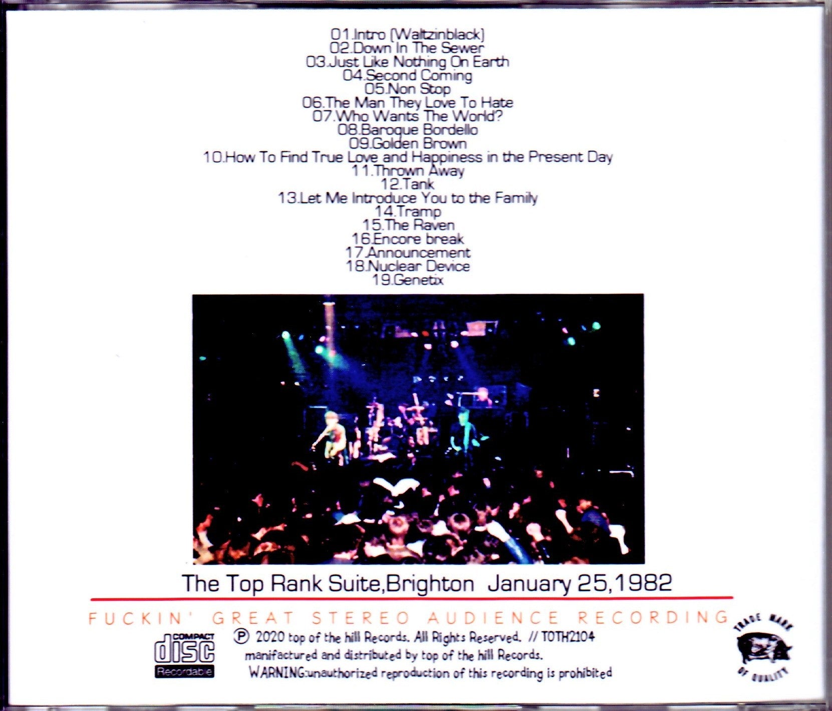 A treasured sound source completely recorded with high-quality stereo audience recording of the live performance about 2 months after the release of the 6th album “LA FOLIE” is now available! A treasured sound source that includes a complete high-quality stereo audience recording of a live performance held at Top Rank Suit in Brighton, about two months after the release of United Artists’ sixth and final album “LA FOLIE”. is now available! It is digitized directly from the master cassette, so there are some parts that are slightly over-leveled, but the range is wide and you can enjoy clear, high-quality sound with a good balance of not only the vocals but also each part! It includes five songs from LA FOLIE, including the opening SE (“Waltzinblack” from the previous album “The Gospel According to the Meninblack”) and the hit number “Golden Brown” which reached number 2 on the UK singles chart. The featured set list features a total of 16 songs, including the opening number Down In The Sewer from his debut album, and the encore, including the single number “Who Wants The World?”, which is not included in the album, for about 70 minutes, with Jean-Jacques’s thick bass roaring. Enjoy powerful performance! 01.Intro (Waltzinblack) 02.Down In The Sewer 03.Just Like Nothing On Earth 04.Second Coming 05.Non Stop 06.The Man They Love To Hate 07.Who Wants The World? 08.Baroque Bordello 09.Golden Brown 10.How To Find True Love and Happiness in the Present Day 11.Thrown Away 12.Tank 13.Let Me Introduce You to the Family 14.Tramp 15.The Raven 16.Encore break 17.Announcement 18.Nuclear Device 19.Genetix
