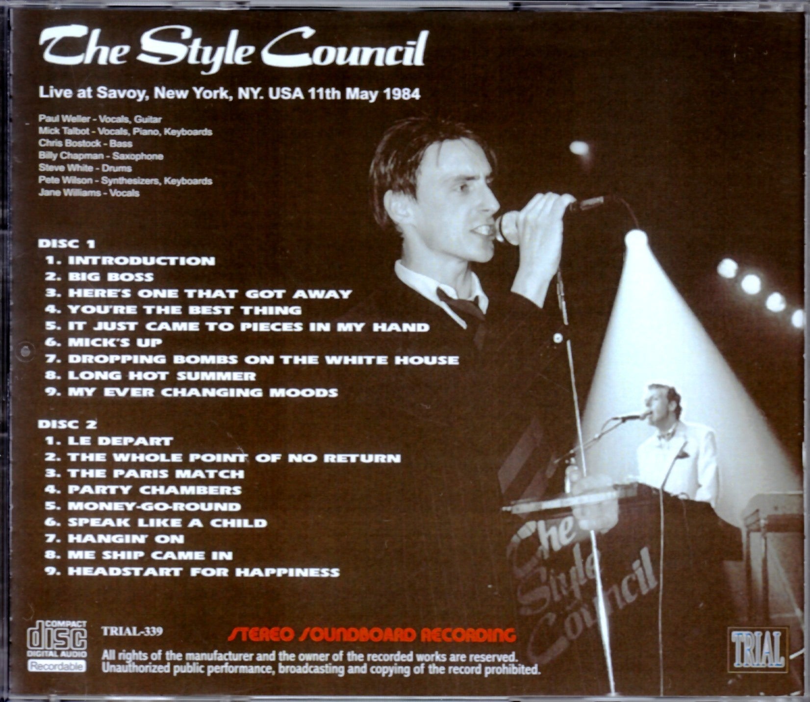A complete recording of the live performance held at the Savoy in New York on May 11, 1984, immediately after the release of the first “Cafe Bleu”, with ultra-high quality stereo soundboard recording from the radio broadcast master. The stage consisting of the initial numbers including songs from the debut mini album “Introducing” is recorded in ultra-high sound quality, and the quality is exactly the same level as the official version! The tasteful band ensemble, including Mick Talbot’s splendid organ playing and master Steve White, makes every song worth listening to, and although it is a sound source from an unusual period in Paul Weller’s career, , their transparent and unique sound, which skillfully incorporates various elements such as jazz, funk, and French pop, is still very attractive even today. The precious early live show that caused a big break in Japan is reproduced here in the highest quality! Disc 1/1. Introduction 2. Big Boss 3. Here’s One That Got Away 4. You’re The Best Thing 5. It Just Came To Pieces In My Hand 6. Mick’s Up 7. Dropping Bombs On The White House 8. Long Hot Summer 9. My Ever Changing Moods Disc 2/1. Le Depart 2. The Whole Point Of No Return 3. The Paris Match 4. Party Chambers /5. Money-Go-Round /6. Speak Like A Child /7. Hangin’ On /8. Me Ship Came In/9. Headstart For Happiness Paul Weller – Vocals, Guitar /Mick Talbot – Vocals, Piano, Keyboards /Chris Bostock – Bass/ Billy Chapman – Saxophone/ Steve White – Drums/ Pete Wilson – Synthesizers, Keyboards/ Jane Williams – Vocals (Live at Savoy, New York, NY. USA 11th May 1984 STEREO SBD)