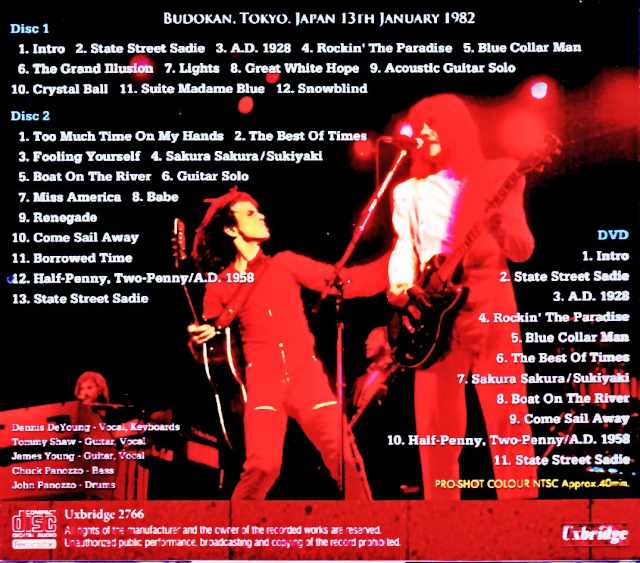 This release couples audio and video footage of the final show of their 1982 Japan tour, held on January 13th at the Nippon Budokan, following the release of their hit album “PARADISE THEATRE.” The CD features a full 2-hour and 13-minute recording of the show from a remarkably good audience master recording for its time, while the DVD contains 40 minutes of footage directly digitized from the aircheck master of the professionally shot TV broadcast of the same concert. Although the video is a digest, the performances of “Sakura Sakura” and “Ue o Muite Arukou,” performed before the acoustic “Boat On The River,” were unique to Japan and are rare to see on video. The entire concert revolves around seven songs from the hit album, interspersed with other representative songs from their earlier career such as “The Grand Illusion,” “Come Sail Away,” and “Babe,” perfectly recreating this night, which was the finale of the tour and when the band shone brightest. Live at Budokan, Tokyo, Japan 13th January 1982 : from Original Masters / PRO-SHOT COLOUR NTSC Approx.40min Disc 1 : 1. Intro 2. State Street Sadie 3. A.D. 1928 4. Rockin’ The Paradise 5. Blue Collar Man 6. The Grand Illusion 7. Lights 8. Great White Hope 9. Acoustic Guitar Solo 10. Crystal Ball 11. Suite Madame Blue 12. Snowblind Disc 2 : 1. Too Much Time On My Hands 2. The Best Of Times 3. Fooling Yourself 4. Sakura Sakura / Sukiyaki 5. Boat On The River 6. Guitar Solo 7. Miss America 8. Babe 9. Renegade 10. Come Sail Away 11. Borrowed Time 12. Half-Penny, Two-Penny / A.D. 1958 13. State Street Sadie DVD : 1. Intro 2. State Street Sadie 3. A.D. 1928 4. Rockin’ The Paradise 5. Blue Collar Man 6. The Best Of Times 7. Sakura Sakura / Sukiyaki 8. Boat On The River 9. Come Sail Away 10. Half-Penny, Two-Penny / A.D. 1958 11. State Street Sadie Dennis DeYoung – Vocals & Keyboards / Tommy Shaw – Guitar & Vocals / James Young – Guitar & Vocals / Chuck Panozzo – Bass / John Panozzo – Drums